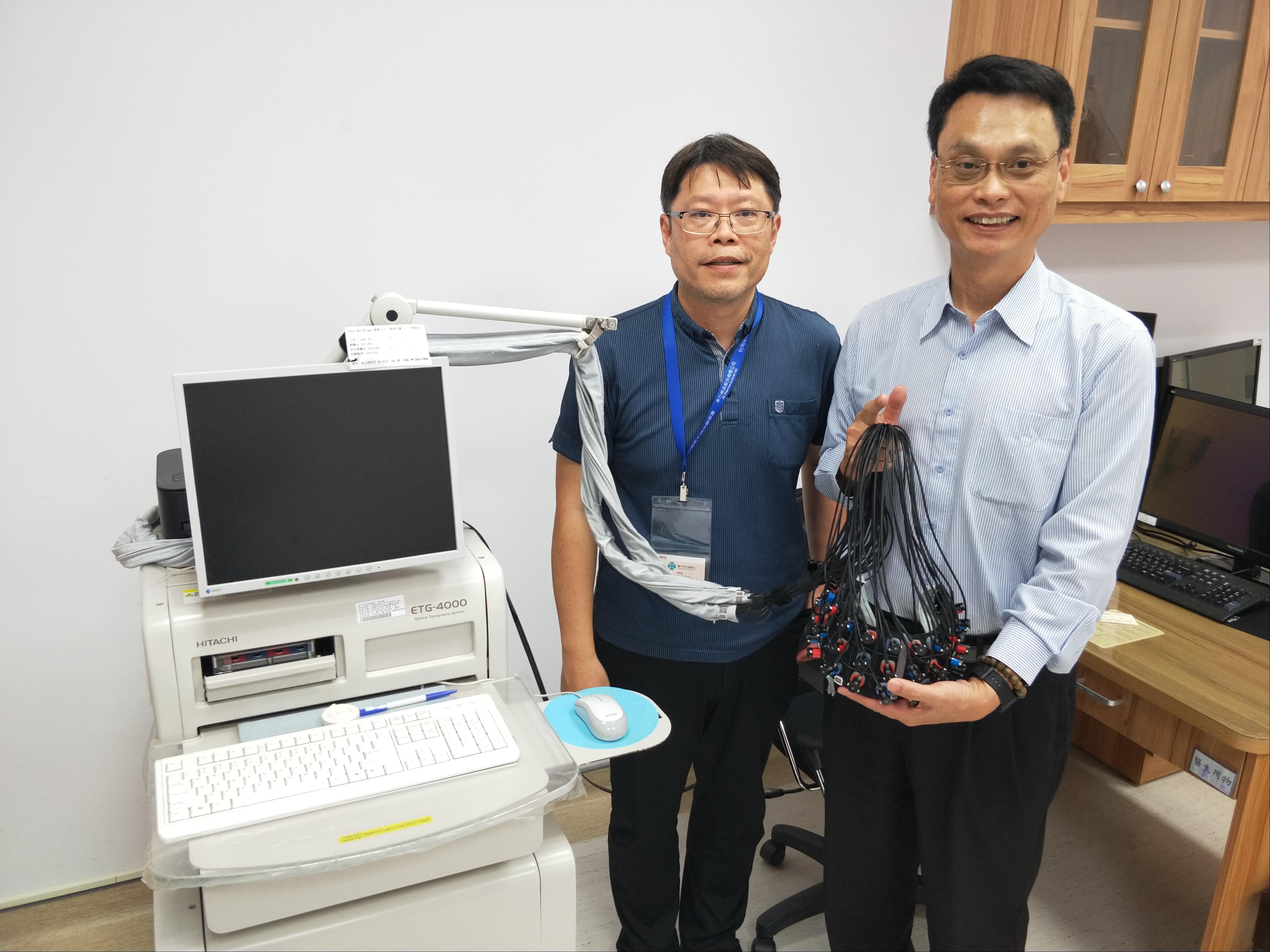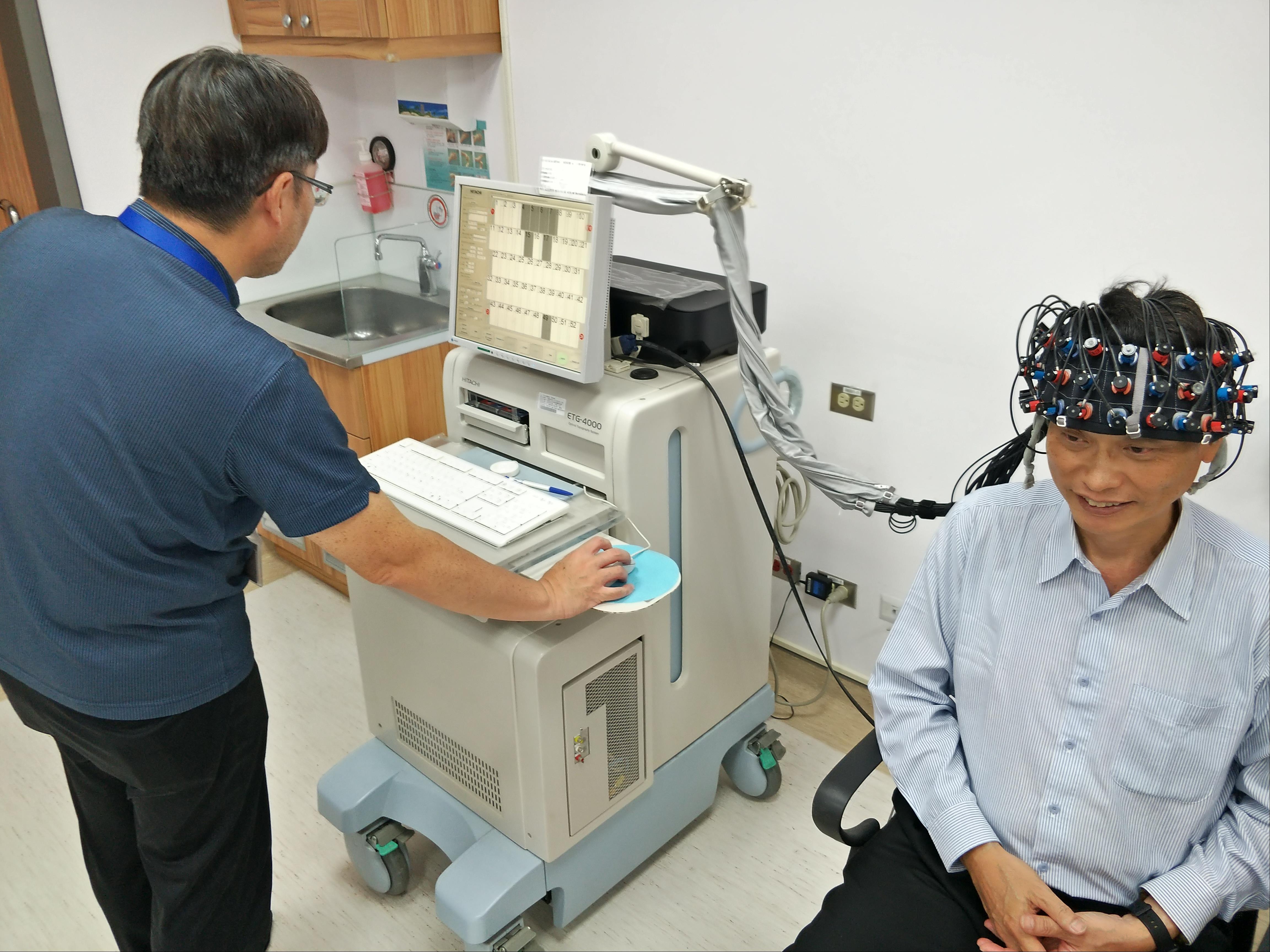 參訪期間藍教授以邱院長為示範,完整地介紹現在台中榮總重覆經顱磁刺激,從定位到治療的所有過程,因此邱院長也如同神農親嚐百草般地接受了一次r-TMS治療。接著藍教授親身示範,讓邱院長執行了一次參數設定及定位。除了r-TMS藍教授也經由邱院長親自體驗,仔細地講解了近紅外光腦功能光譜檢查儀(NIRS)及自律神經檢測儀(HRVs)的原理及操作,整個參訪行程以實作為核心,對r-TMS儀、NIRS儀及HRV三種診療儀器進行了完整的體驗。