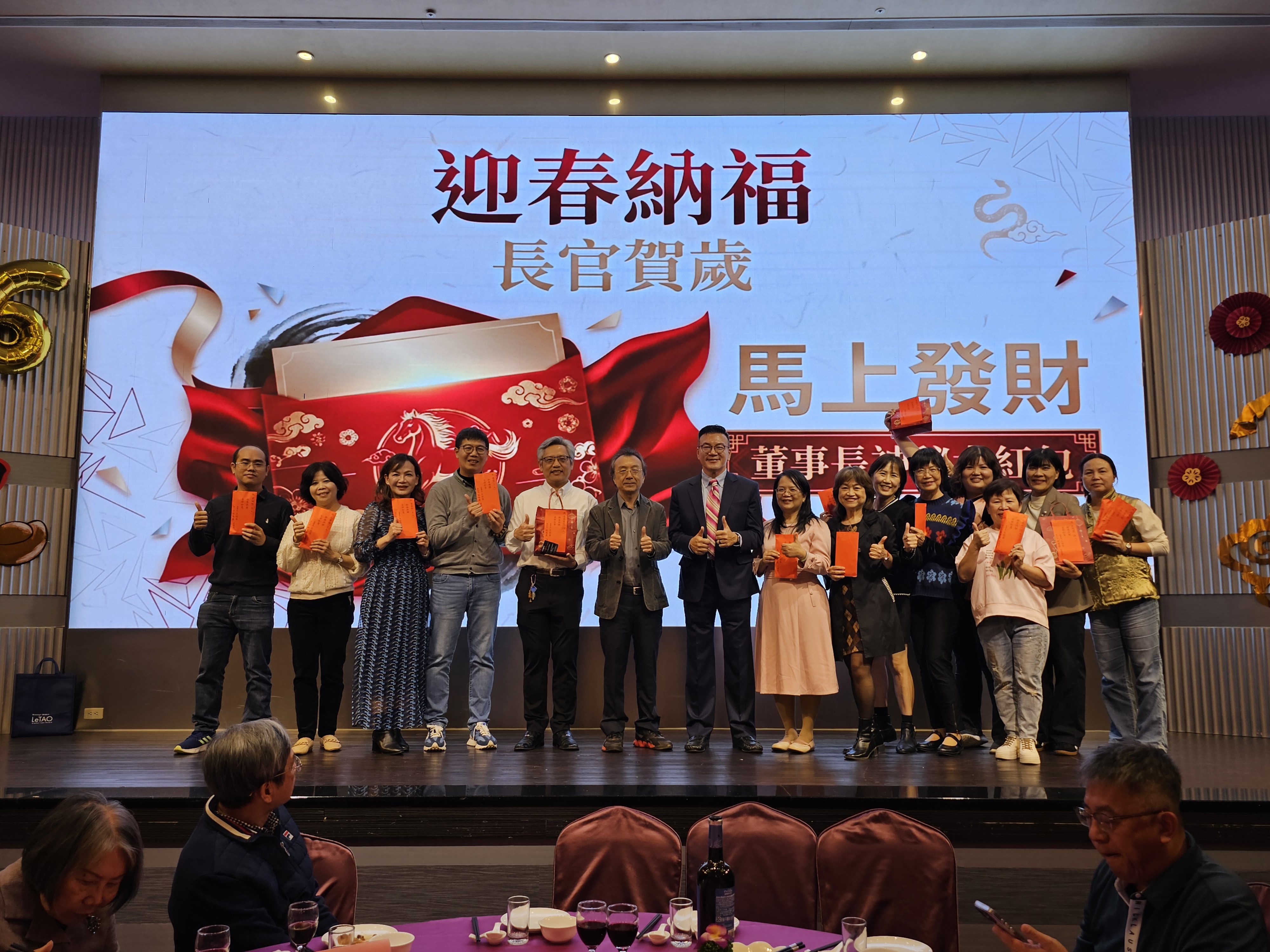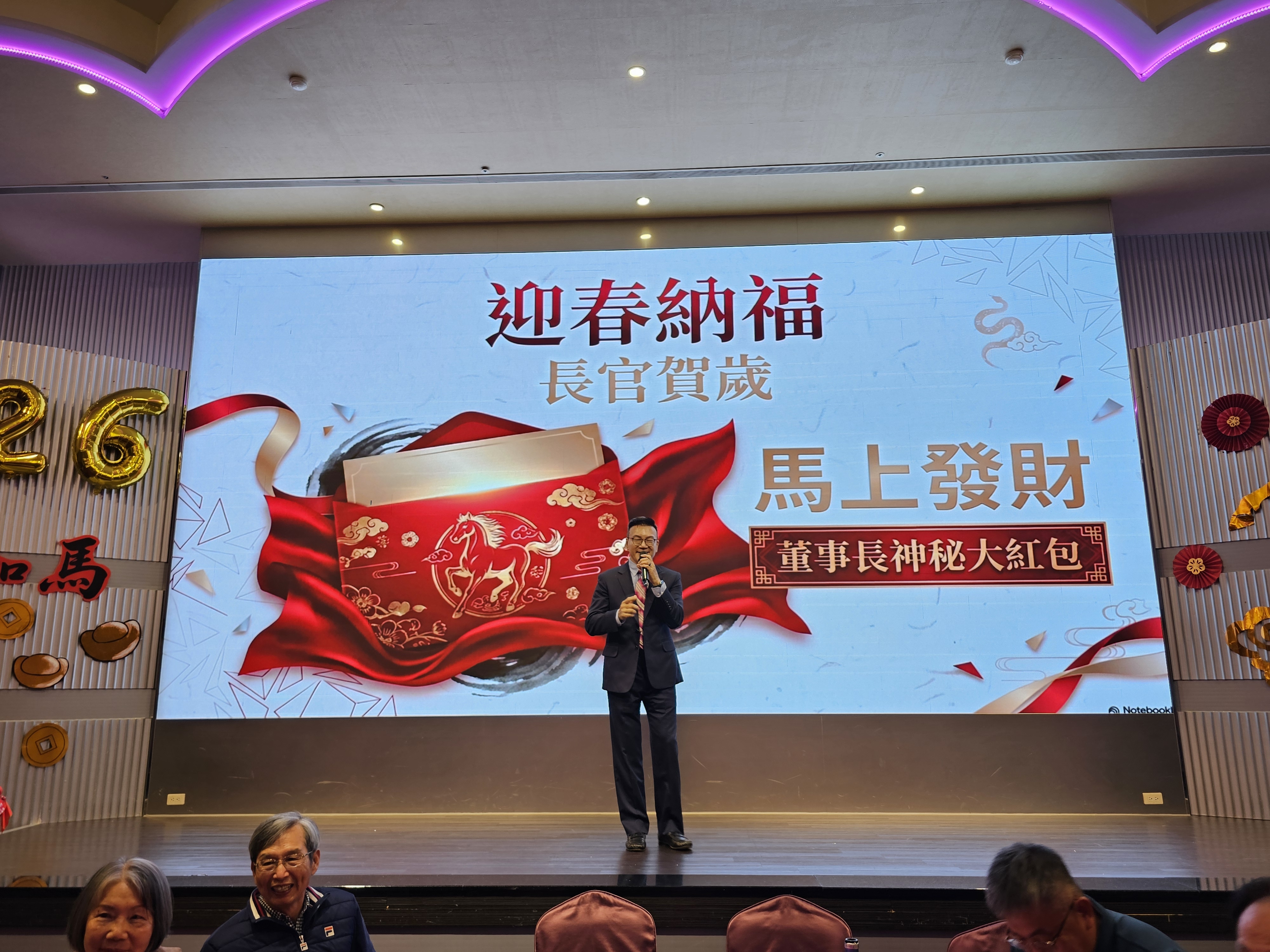 主持人倒數節奏下揭開尾牙活動序幕,董事長開心的指出114年度令人感到傲人的成果,肯定同仁過去一年的貢獻,同時感謝各領導主管對工作的用心付出,頒贈神祕大紅包,也勉勵大家持續以積極的態度迎接新一年的挑戰。