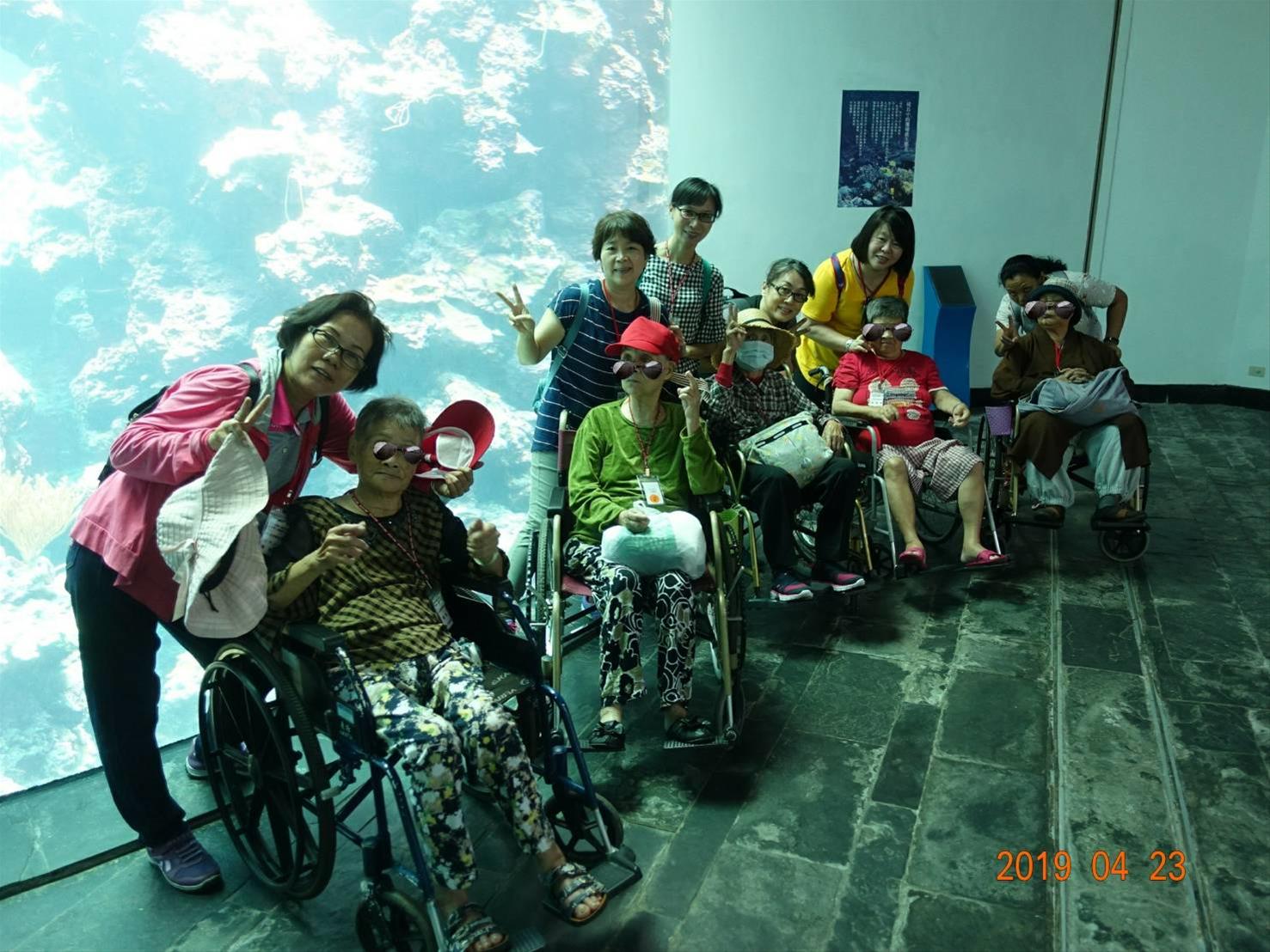 一、二組的長輩第一個參觀的是珊瑚王國,巨大的水族缸、從身邊悠游而過的繽紛魚群、置身海底隧道、欣賞小白鯨可愛的游姿等種種療癒美麗的景象,讓長輩及工作人員驚呼連連。三、四組的長輩首先參觀的是台灣水域館,館內有各式各樣在台灣水域生長的魚種,並介紹台灣水域的獨特性。參觀時間正巧遇到餵食秀,身穿潛水裝備的工作人員拿著餌料,餵食水族缸內的魚群,並配合解說員專業的解說,大家都增長知識了。