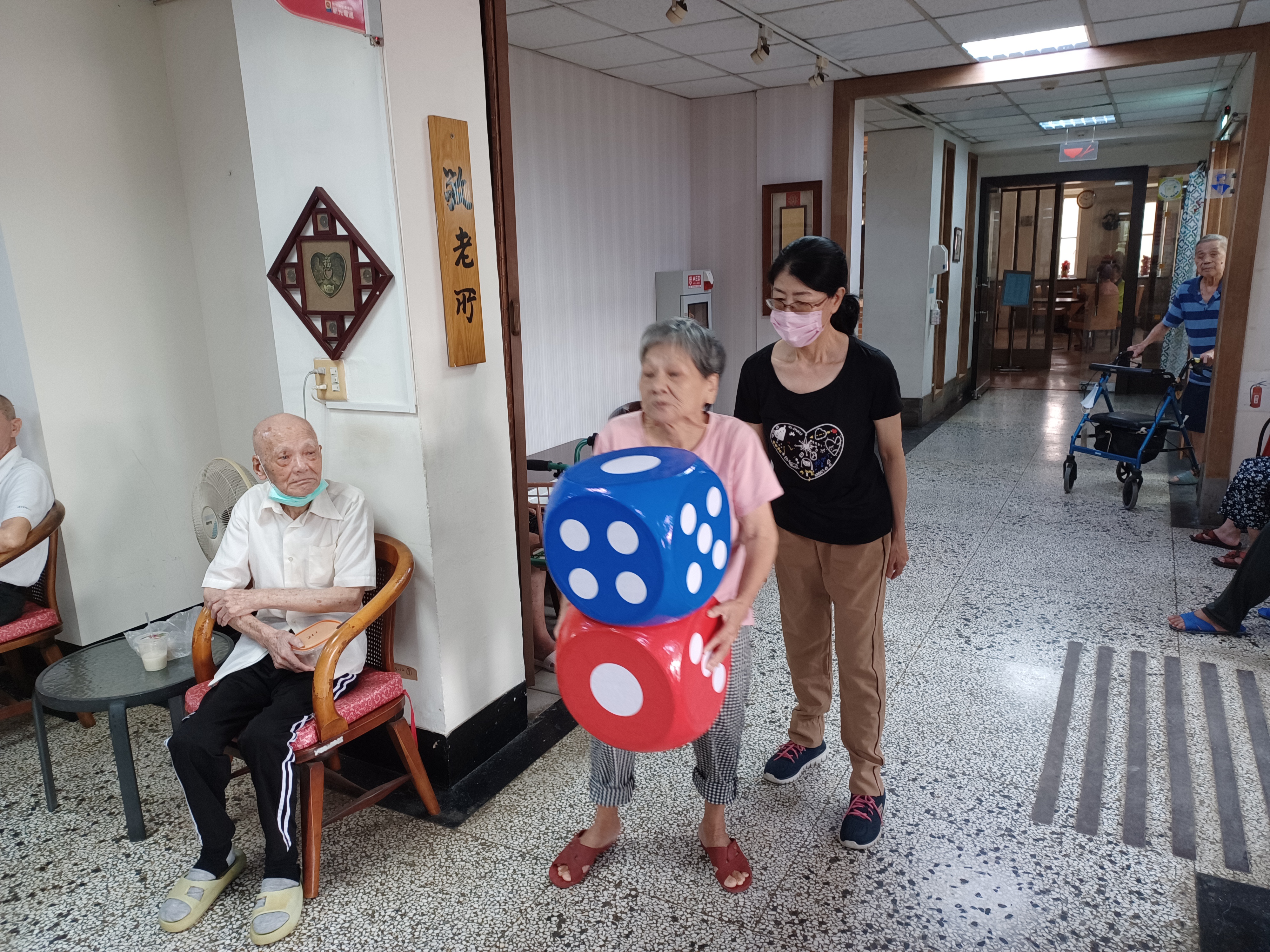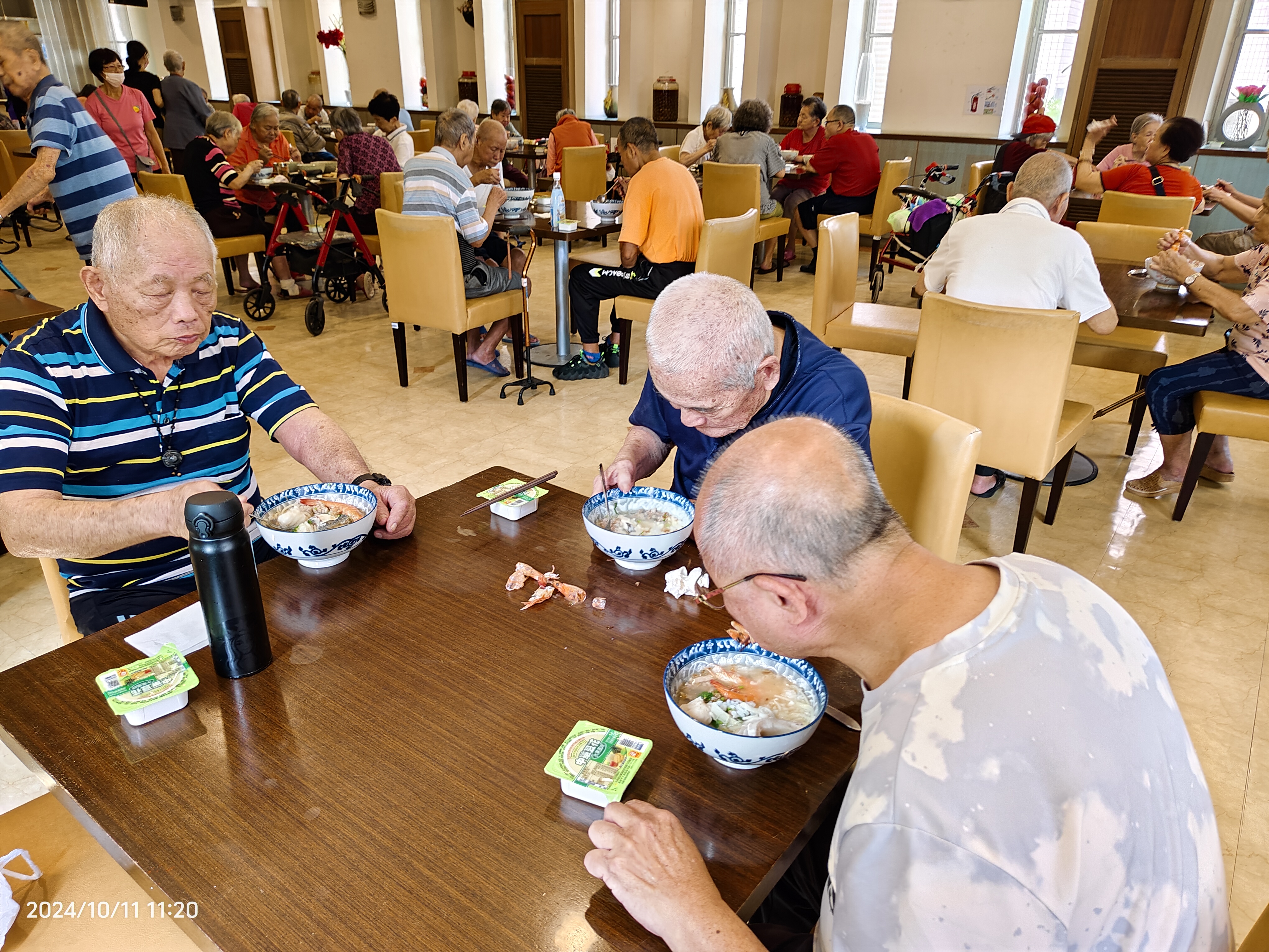 為了歡慶重陽節,工作人員於圖書室精心佈置今年以來長輩創作多幅的粉彩畫作展覽及戶外擲骰子競賽遊戲,讓長輩開心玩遊戲。遊戲採分組競賽,長輩聚精會神的擲骰子,擲出最高分者,可獲得精美禮物,贏得禮物的長輩開心的笑開懷。另外所內特別準備超鮮美海鮮粥,鮮蝦、海鱸魚、福州魚丸、綠竹筍等,媲美餐廳的美味料理,長輩直呼:『海鮮鱸魚粥,魚新鮮蝦子又大,真的太棒了,度過了吉祥快樂的重陽節』。
