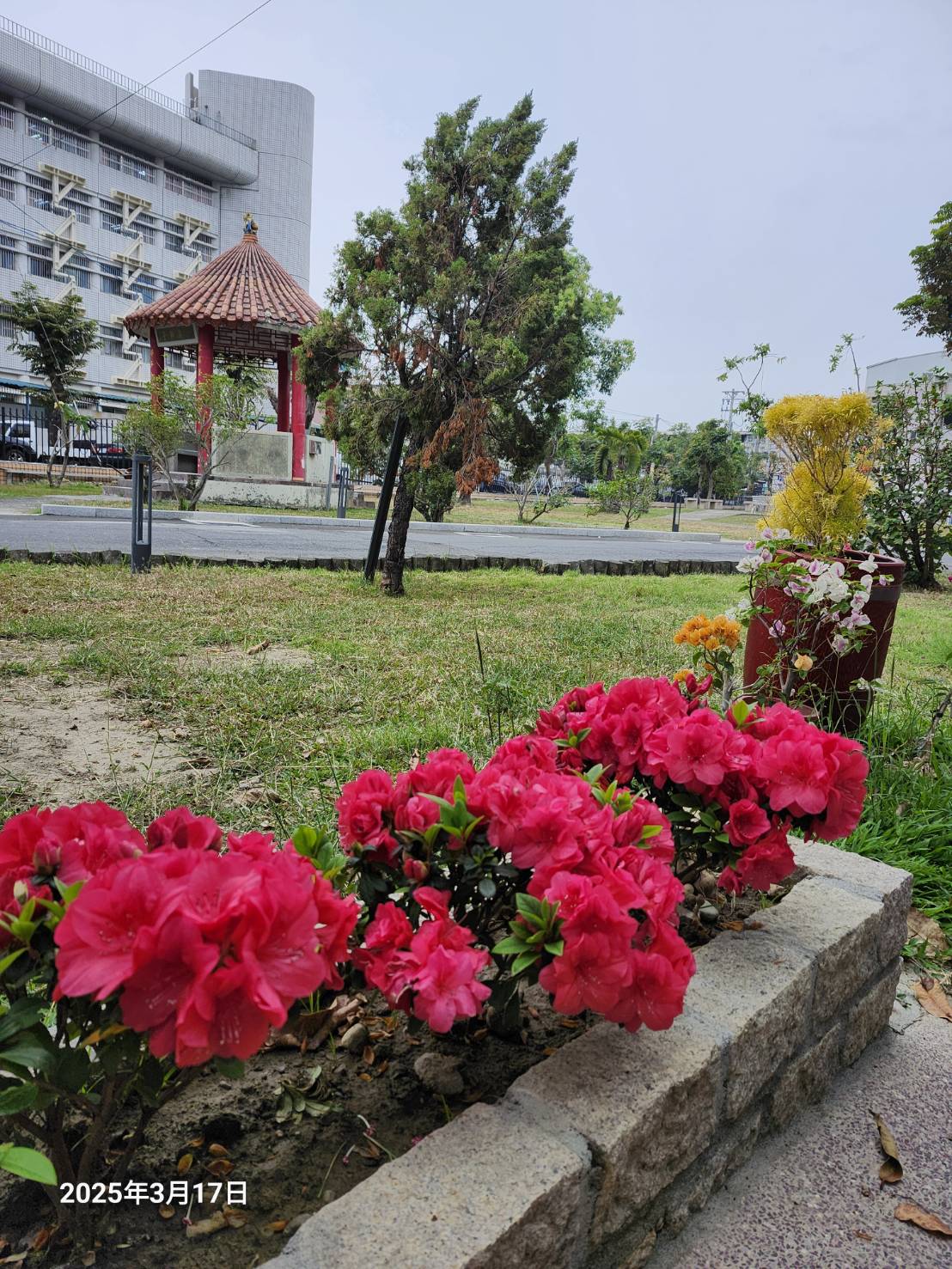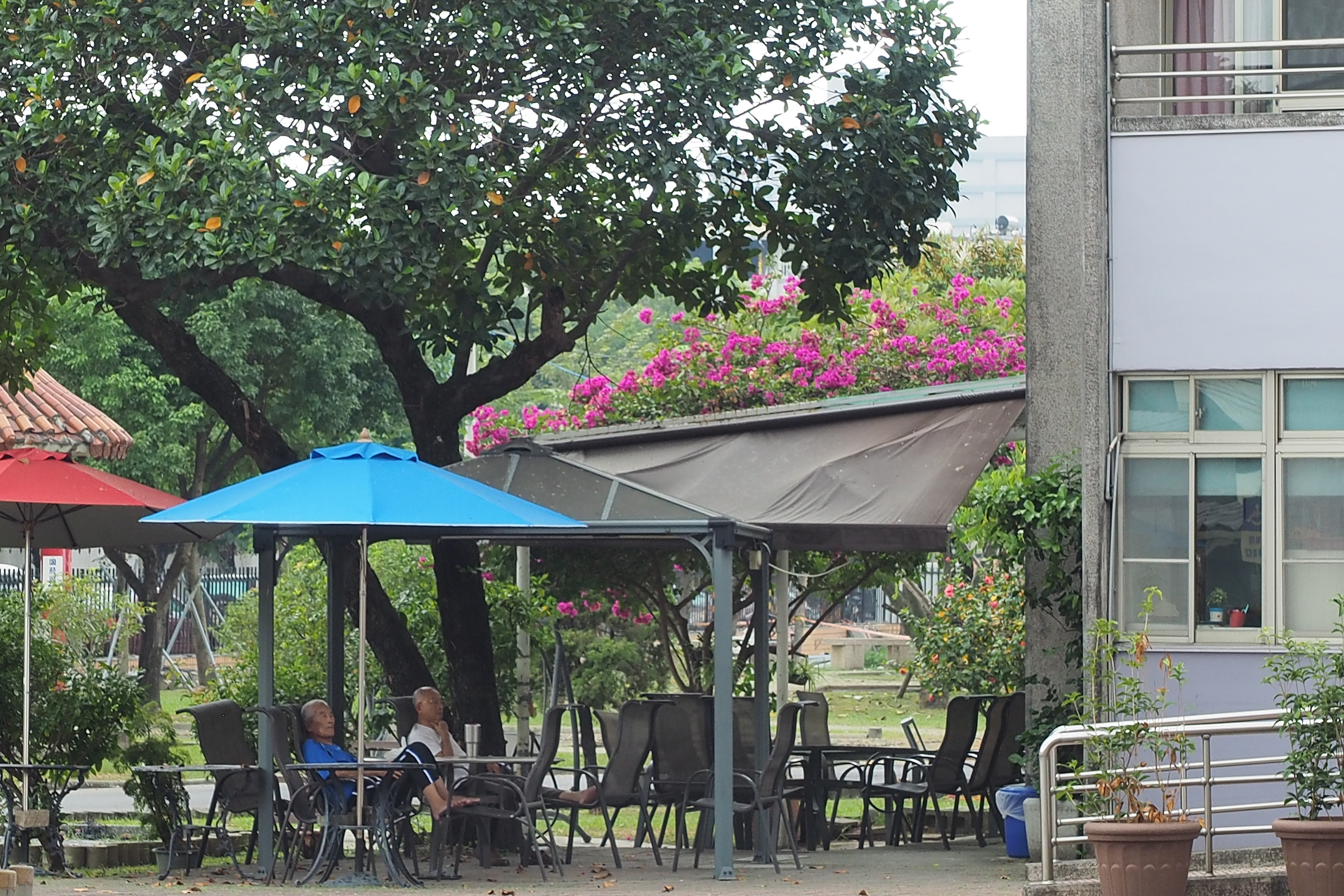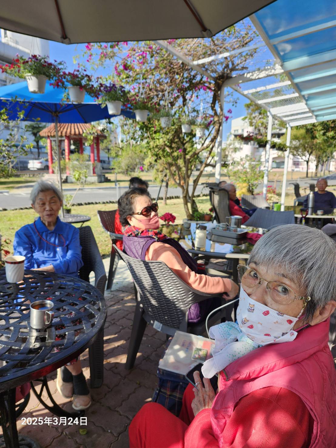 經歷一番重建及布置後,在這個春天泡茶區又重新開張啦~這次新增了許多桌椅,可以容納更多的長輩一起泡茶,另外主管們希望這個空間能充滿鳥語花香,因此四周也特別種植了大量花卉美化環境,棚架設計一半可遮陽,一半採取花架的模式,並種下盤藤植物,相信未來這些植物能照著我們的期許沿著棚架攀爬,形成一片美麗又自然的遮陽花棚,讓長輩們在泡茶之餘,也可以盡情賞花。