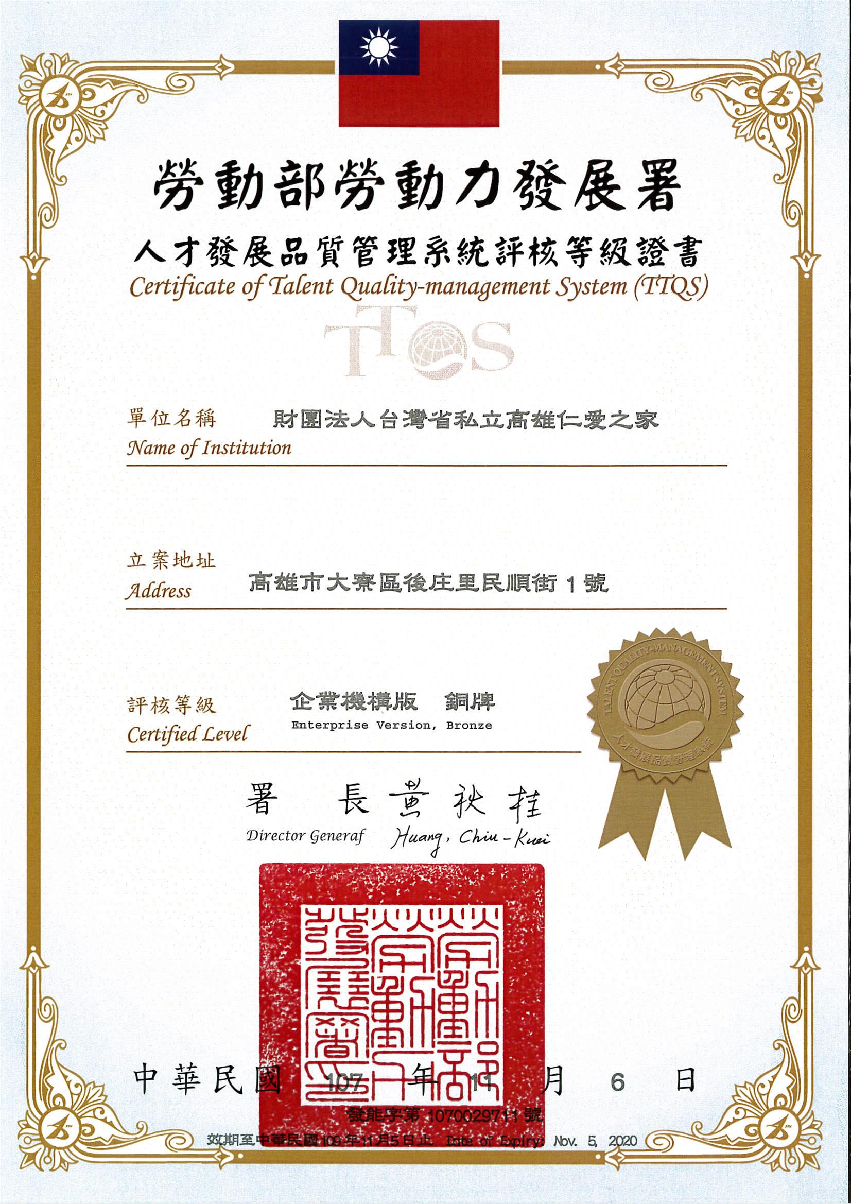 本家自101年首次參與TTQS認證,即獲得銅牌的成績,本家業務單位尤以附設玫瑰園養護所力行落實TTQS人才發展管理系統為最。近年來,申請企業人力資源提升計畫補助的課程包羅萬象,有身心障礙福利機構進階與專業能力提升課程、室內空氣品質管理員訓練、照顧服務員專業課程、長期照護人員專業課程、採購人員專業課程、資訊安全訓練課程、標竿學習等,本家各單位同仁於今年10月17日第三次參加TTQS評核,持續獲得銅牌獎,對於受評單位玫瑰園養護所,及主責單位人事組都是一項肯定。