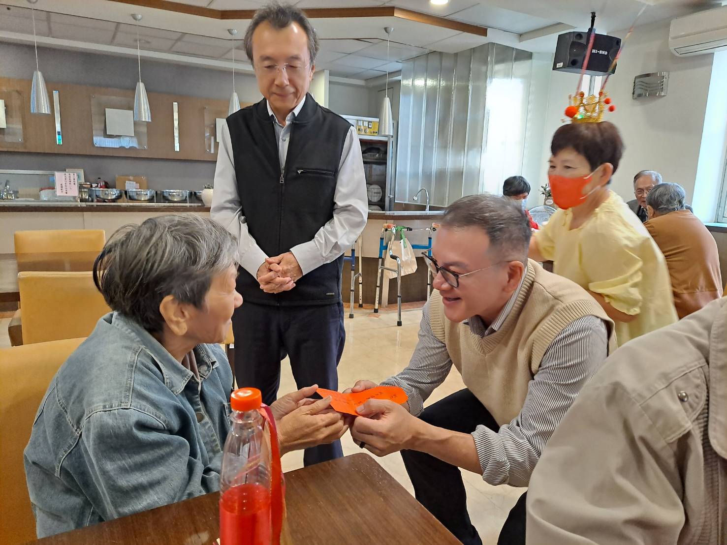 董事長一進門,便面帶微笑地向長輩們拜年:「祝大家新年快樂,身體健康!」,長輩們紛紛回以熱烈的掌聲和笑容,董事長逐一走到每位長輩面前蹲下,雙手遞上紅包,並親切地噓寒問暖,他的關懷讓每位長輩感受到濃濃的溫情,許多長輩接過紅包時,雙手緊緊握住,眼中盡是感動,他們不僅感謝董事長的心意,更感謝機構對他們的用心照顧,壽美奶奶更是即興說起「四句聯」的祝福詞。