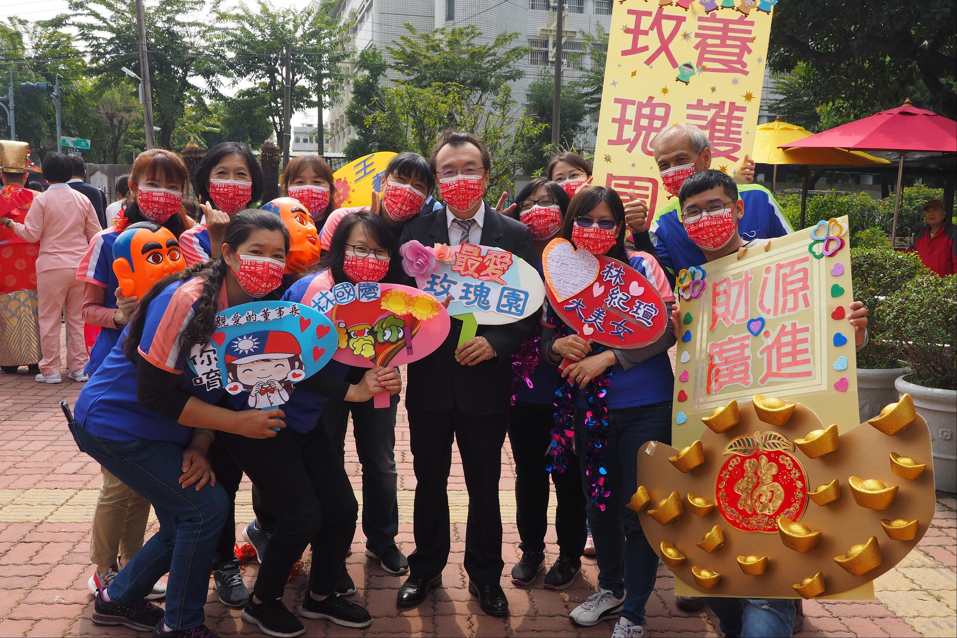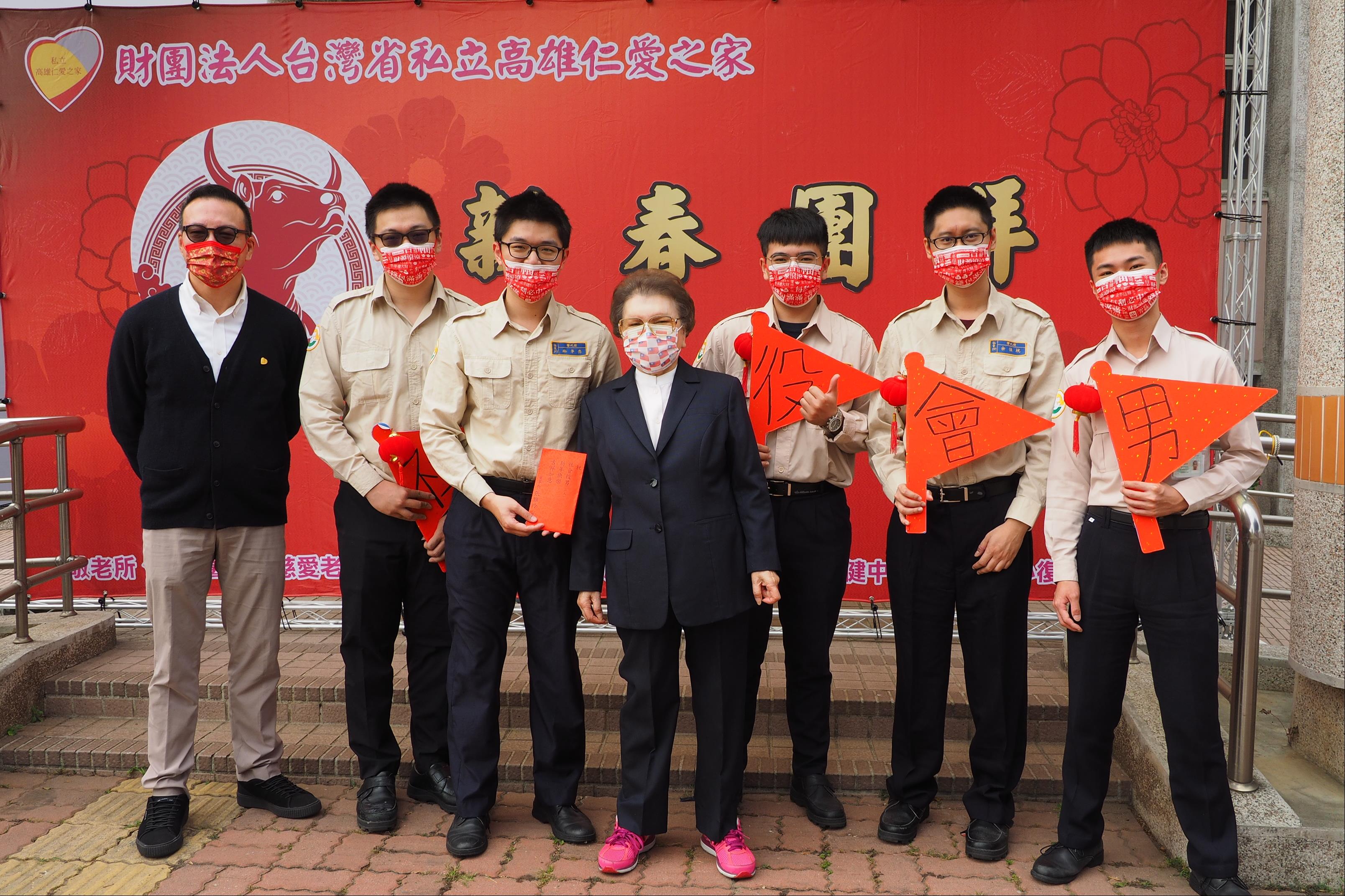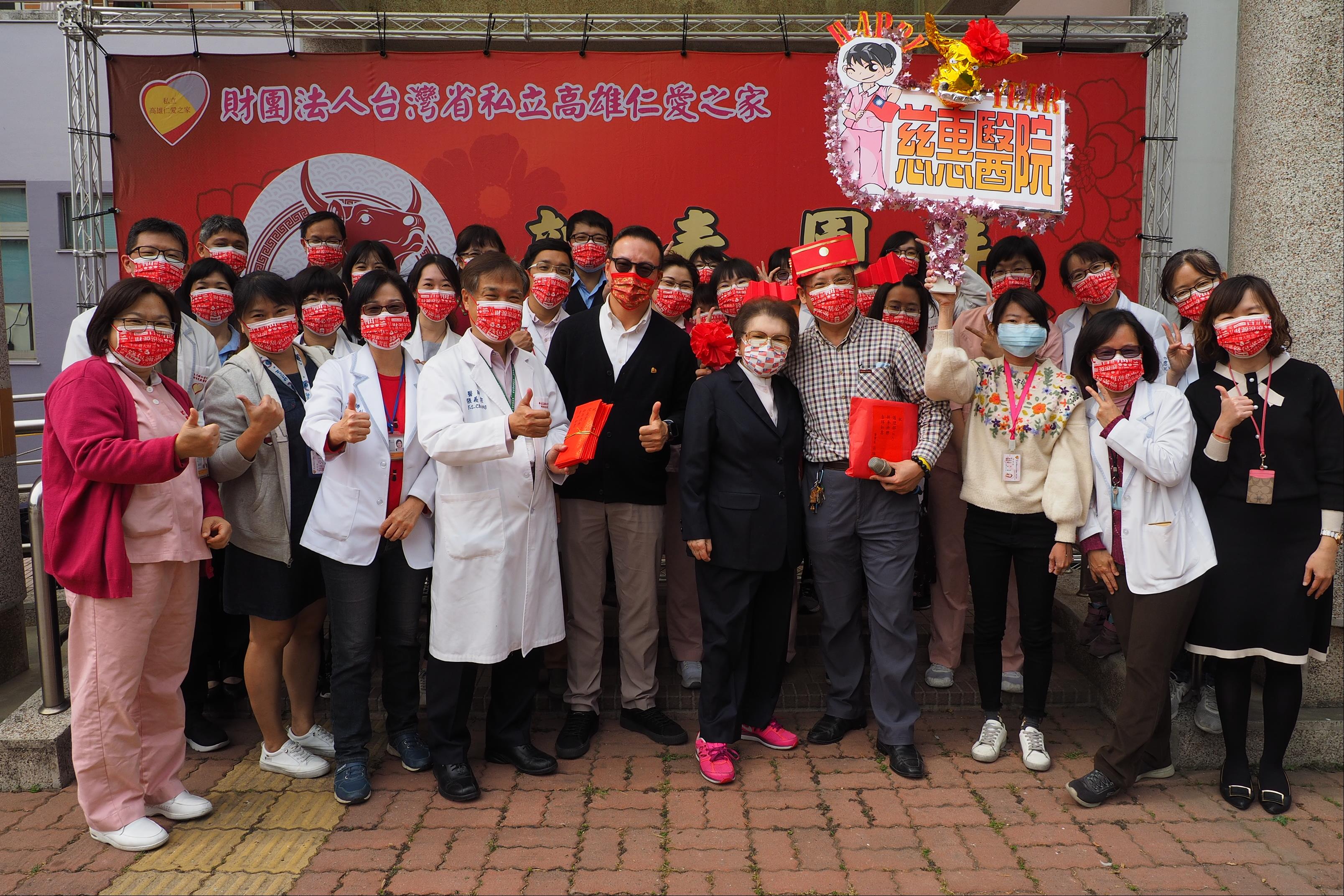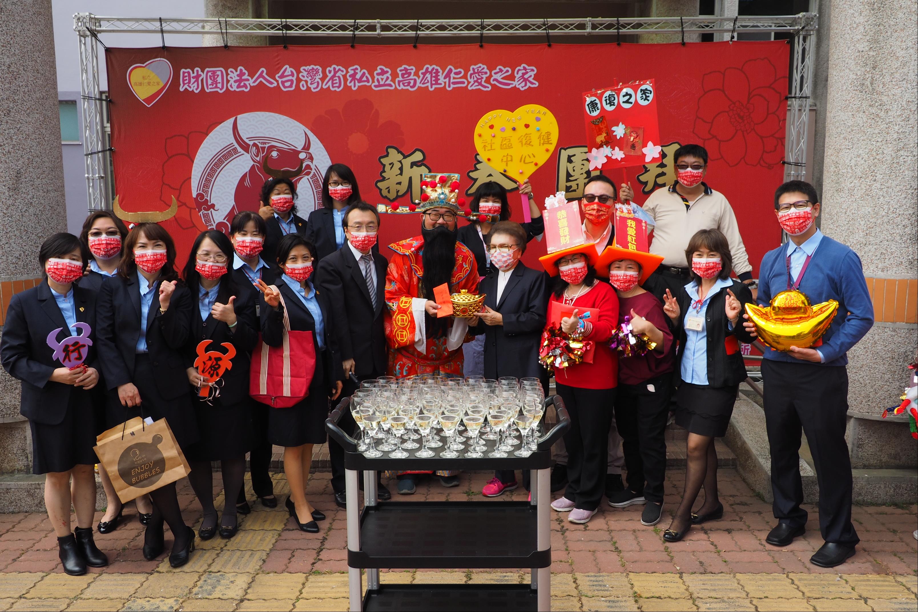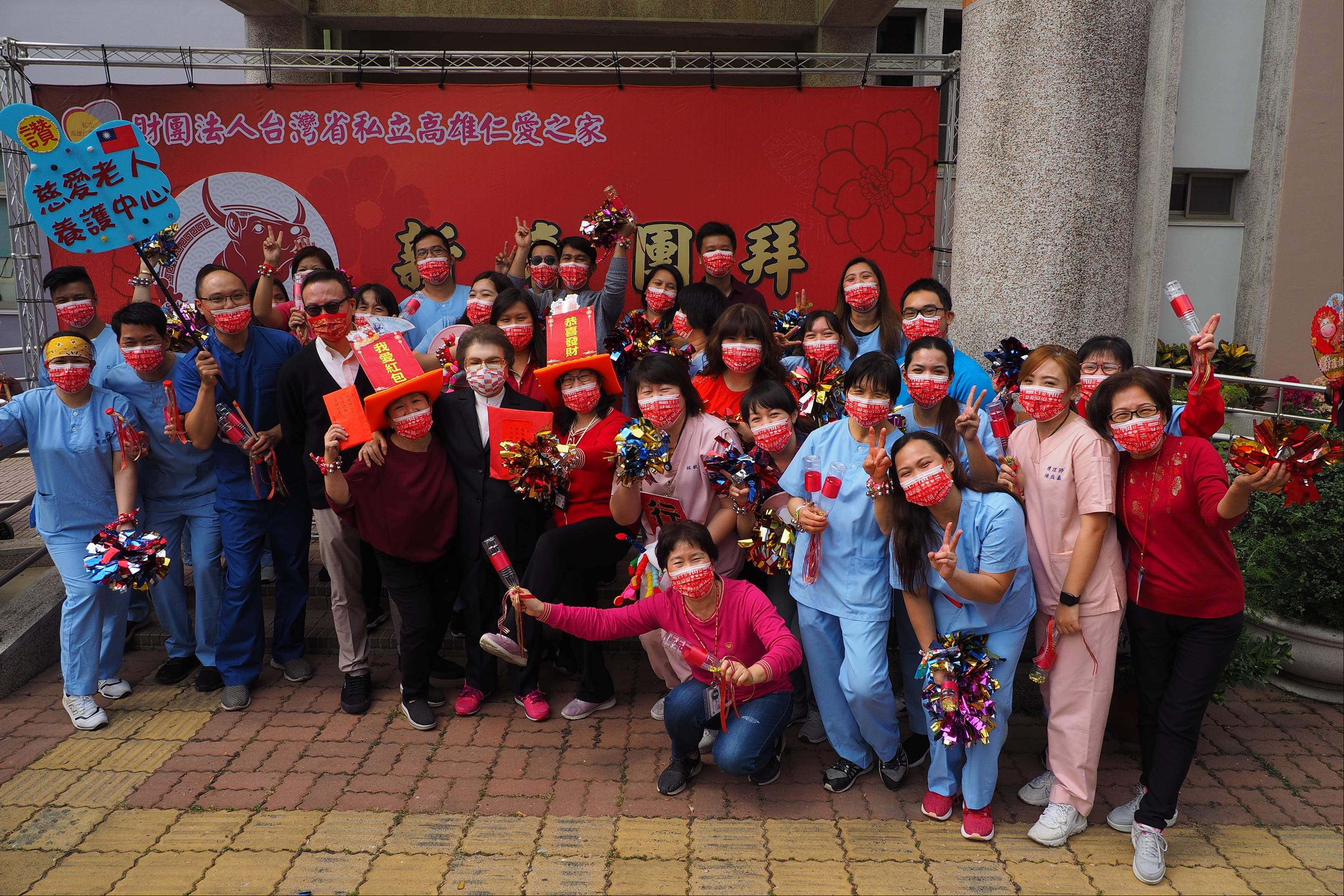 開春氣息濃,私立高雄仁愛之家迎春納喜賀新年,今年2月18日(星期四)上午十一點良辰吉時於本家大門口舉行了溫馨隆重的新春祭天祈福暨團拜活動,由仁愛之家的大家長張雅玲董事長率領王敬豪董事、林國慶執行長、慈惠醫院鍾偉倫院長、慈愛老人安養護中心馬榮梨主任、玫瑰園養護所黃毓純主任、康復之家周保君主任、社區復健中心楊坤霖主任以及本家行政組各主管向所有同仁拜年道賀,祝福大家新春快樂、事事如意。