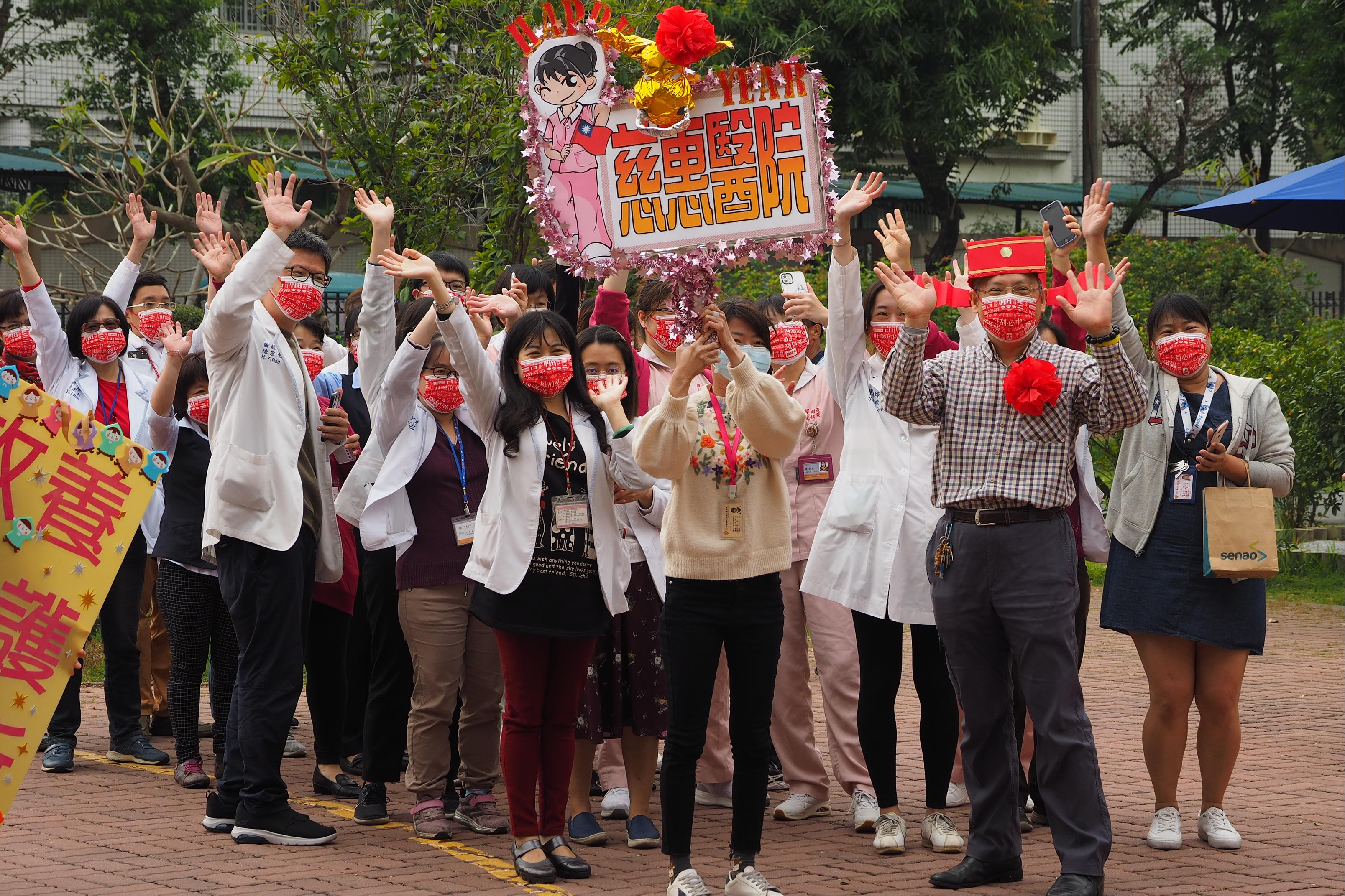 慈惠醫院鍾院長頭戴狀元財神帽子打頭陣,帶領一級主管高高舉起紅布條祝賀。 -