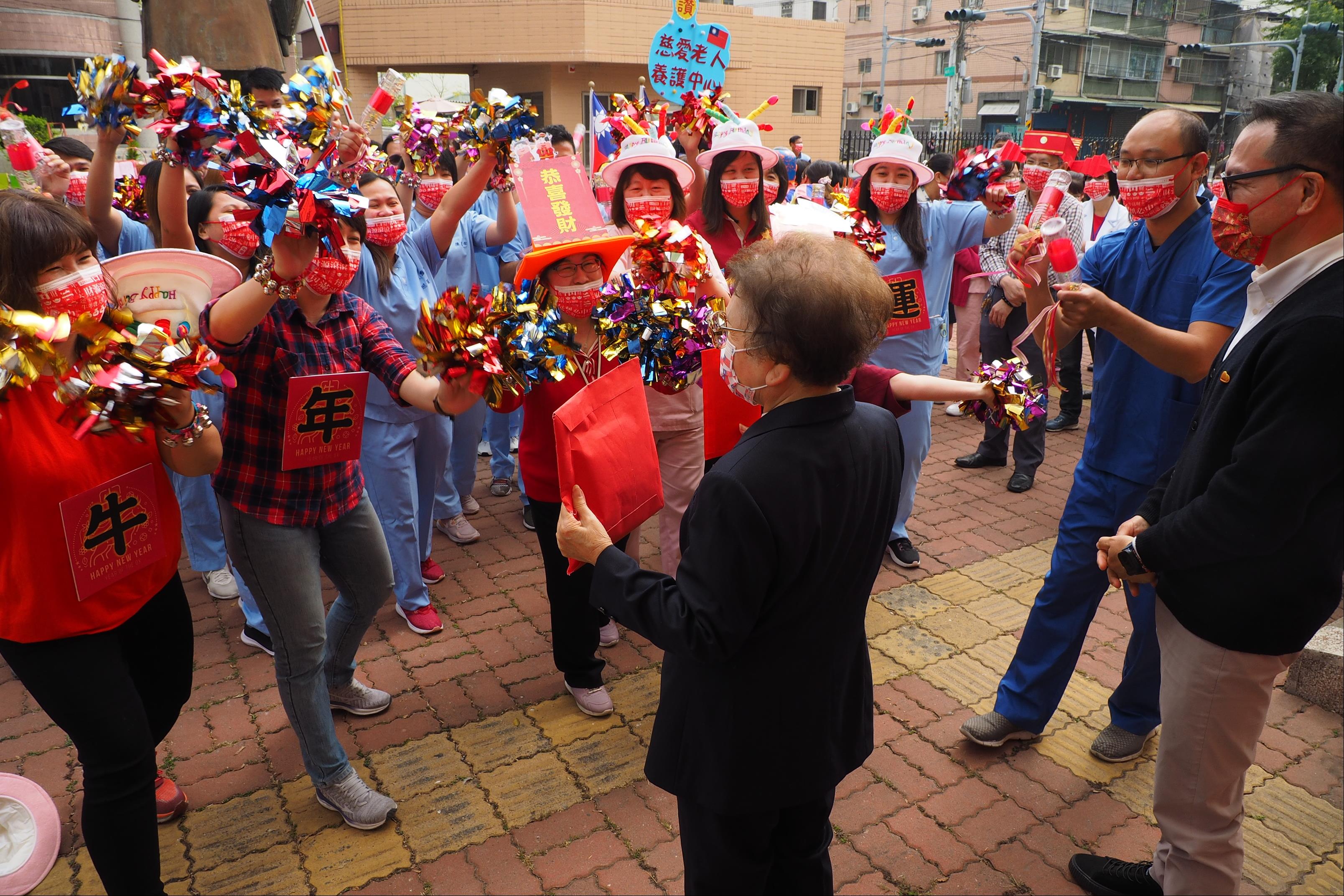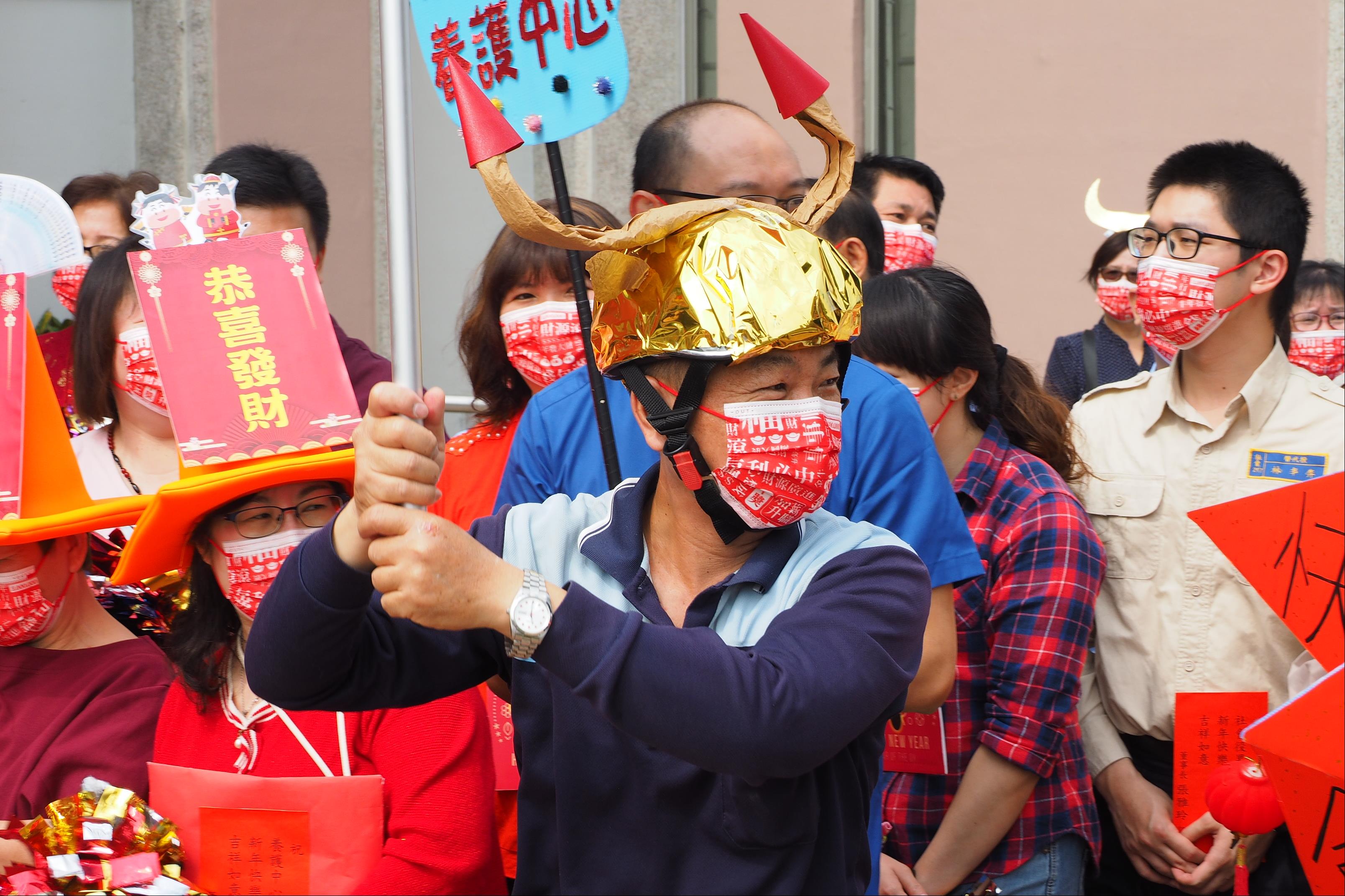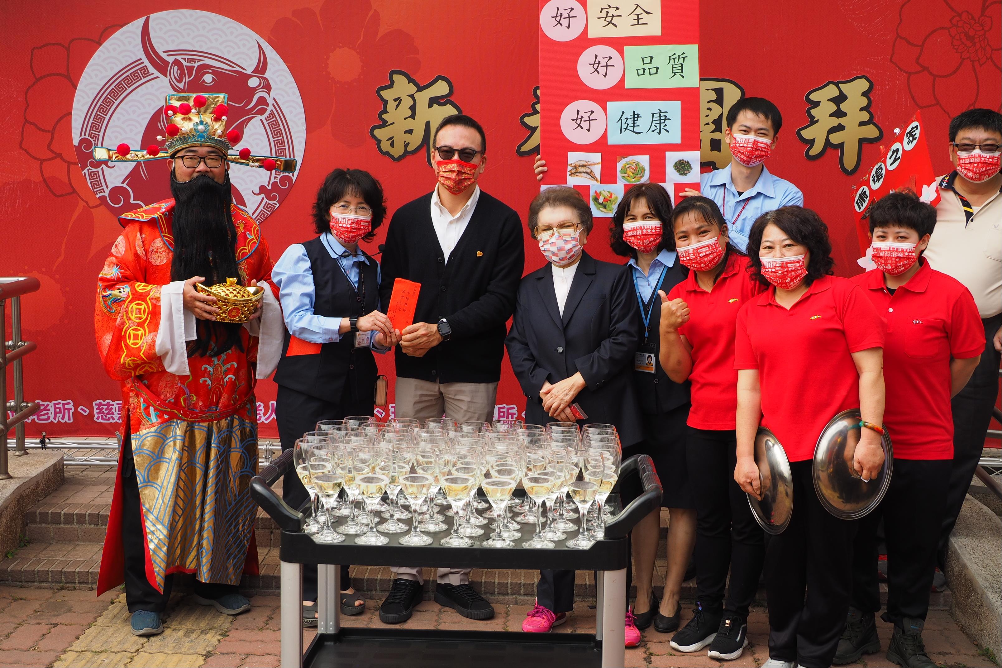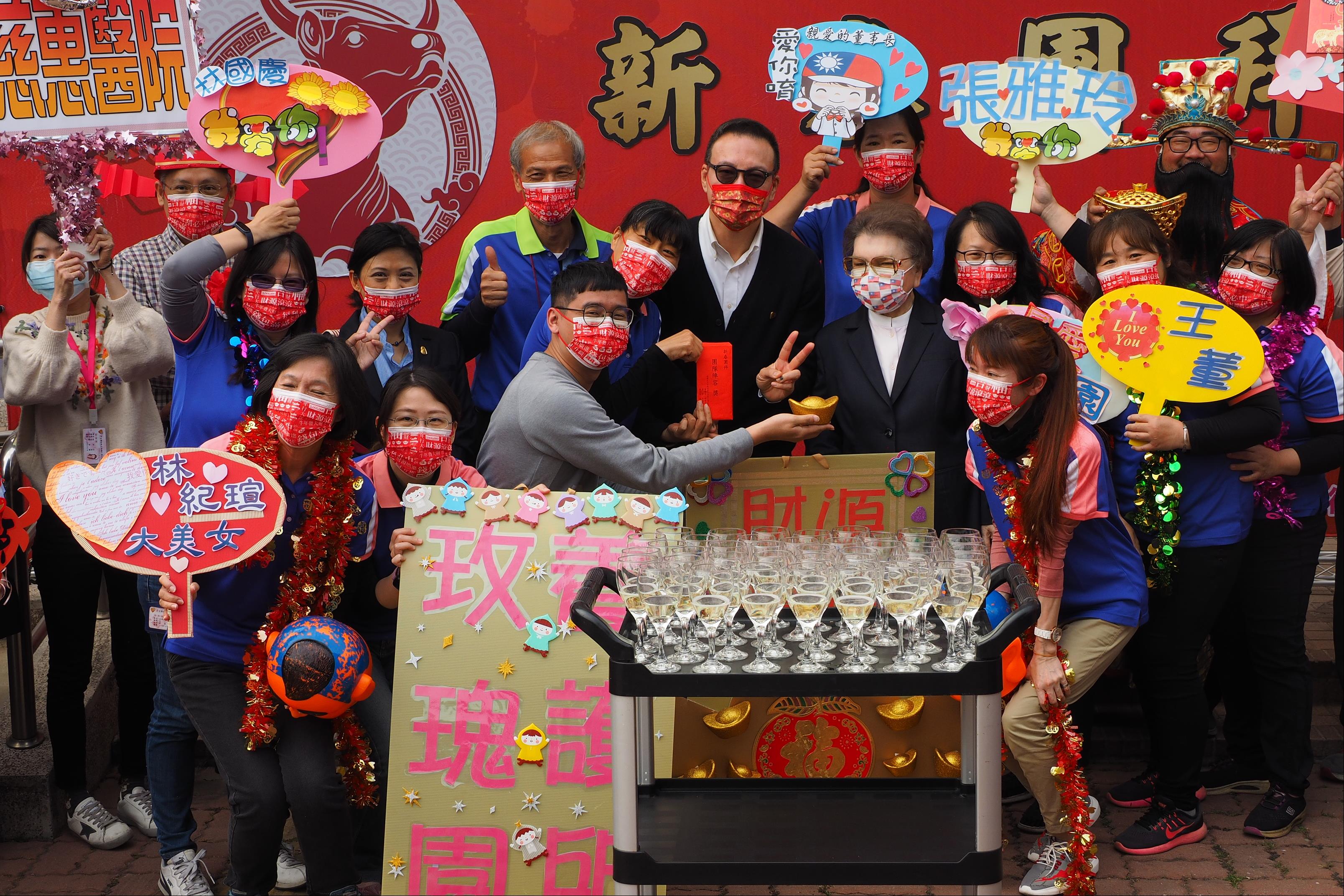 為因應『COVID-19』疫情,新春團拜活動不僅在通風良好且空曠庭園廣場舉行,參與者全程配戴口罩,連祝福詞都改為「勤洗手、戴口罩、賀新年」等宣導應景標語,形成別具特色的特殊畫面。總務組郭秀容組長貼心為大家準備了香檳、甜湯與水果,讓大家嘴甜心也甜,藉著這個版面,記錄大家共同有過的開心與防疫的日子,願大家健康平安、圓圓滿滿、病毒快快遠去!並祝賀私立高雄仁愛之家「牛兆豐年」、「牛市再現」、「牛氣沖天」、「牛轉錢坤」、「牛年發大財」,敲響新春開工的第一砲。(文:家本部/家秘書/林紀瑄)