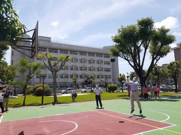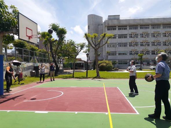慈惠醫院籃球場驗收啟用,王董事長、林執行長及鍾院長與總務組共同驗收開球,場面熱鬧。 -