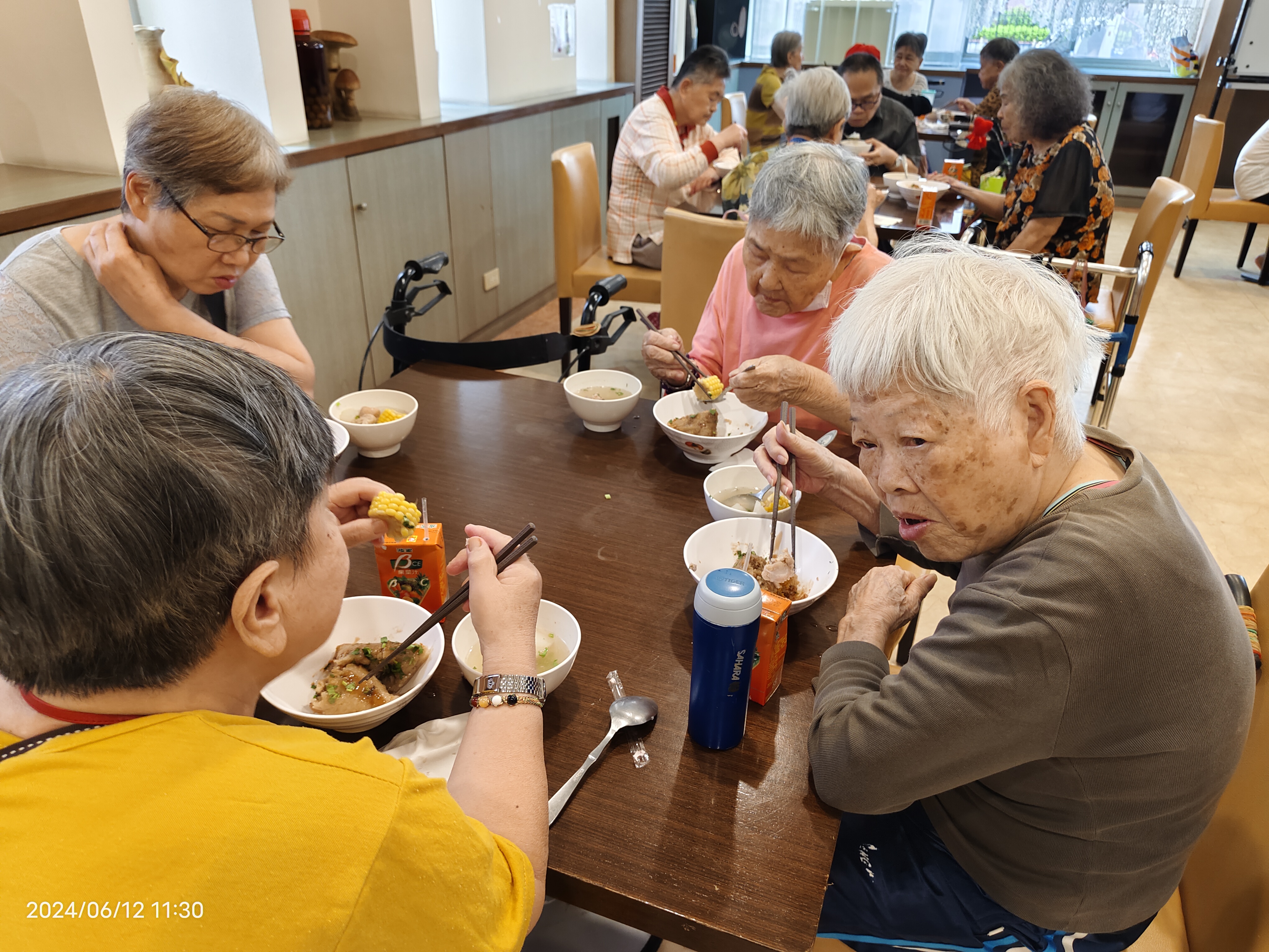 台灣的梅雨季節在5、6月氣候總是陰晴不定,今年的端午節活動豔陽高照,工作人員一早就準備蒸煮粽子,長輩期待端午節慶的傳統美味食物粽子粉墨豋場,懷念的古早味粽子,有醬油膏、甜辣醬、香菜、花生粉ㄆㄨ在粽子上,美味可口、工作人員合力烹煮鮮美雞肉蔬菜湯,長輩粽子一粒接一粒,湯品一碗接一碗,長輩豎起大拇指喊讚喔。。