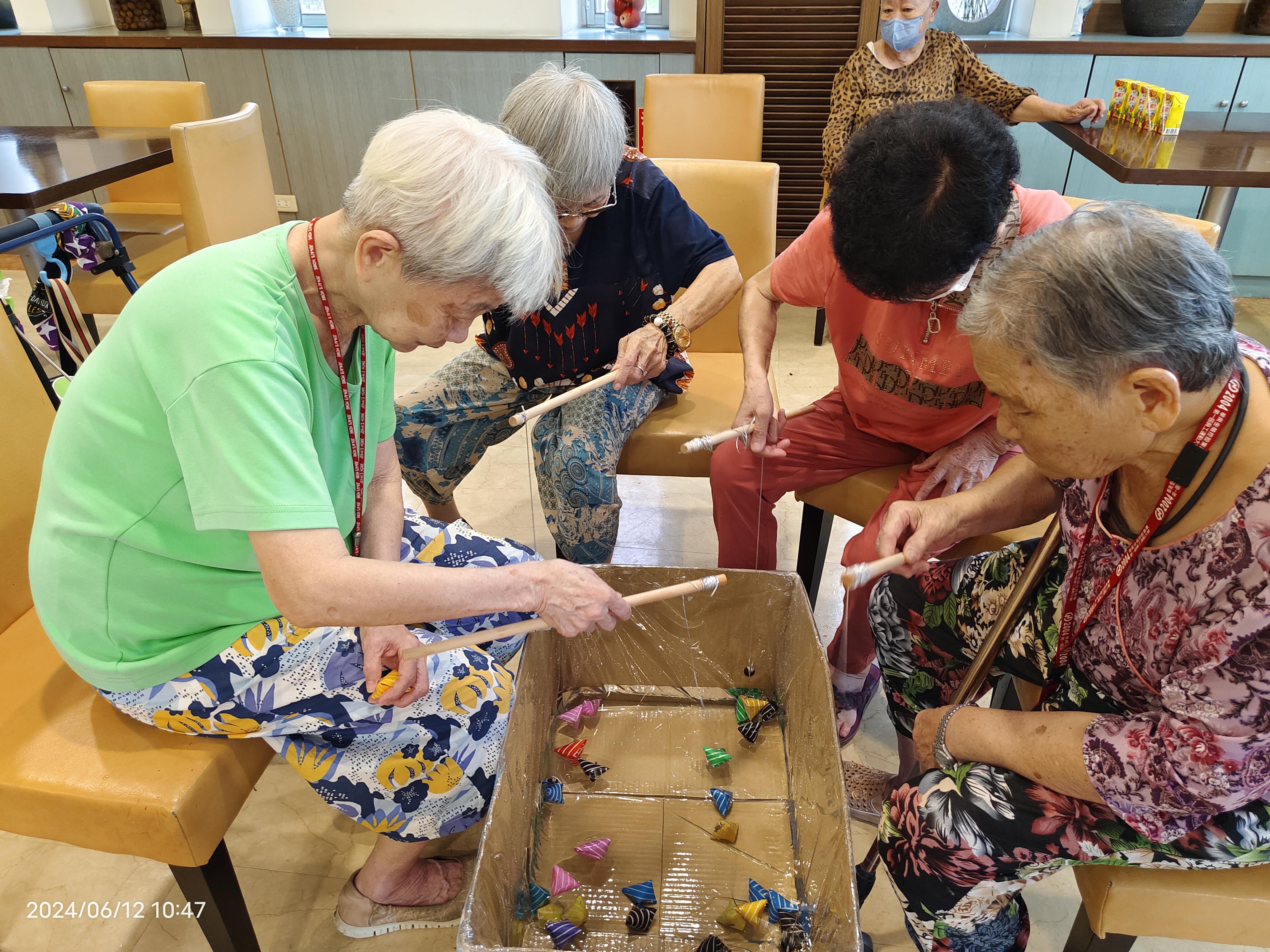 歡慶端午節特別設計趣味遊戲釣粽子活動讓長輩參與,每次活動為4人一組,釣到最多粽子的長輩有精美禮物一份,大家聚精會神努力釣起粽子,比賽結束後興致未減還繼續嘗試釣粽子,整體活動讓長輩享受美食及端午節的氛圍,也豐富日常生活。(文:敬老所/馮意茳社工師)