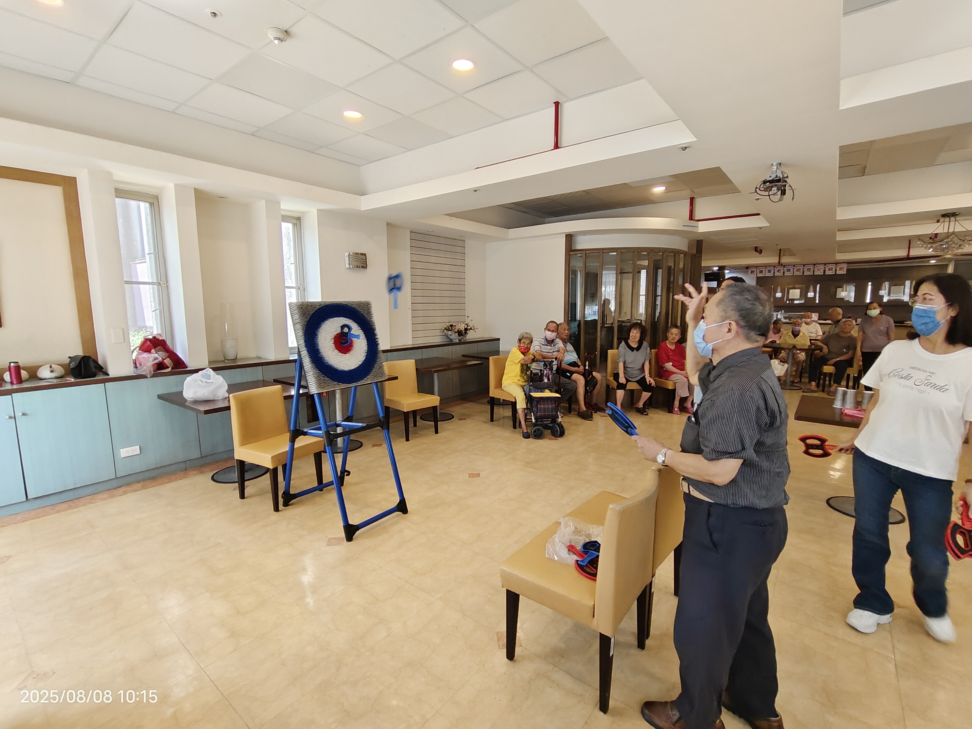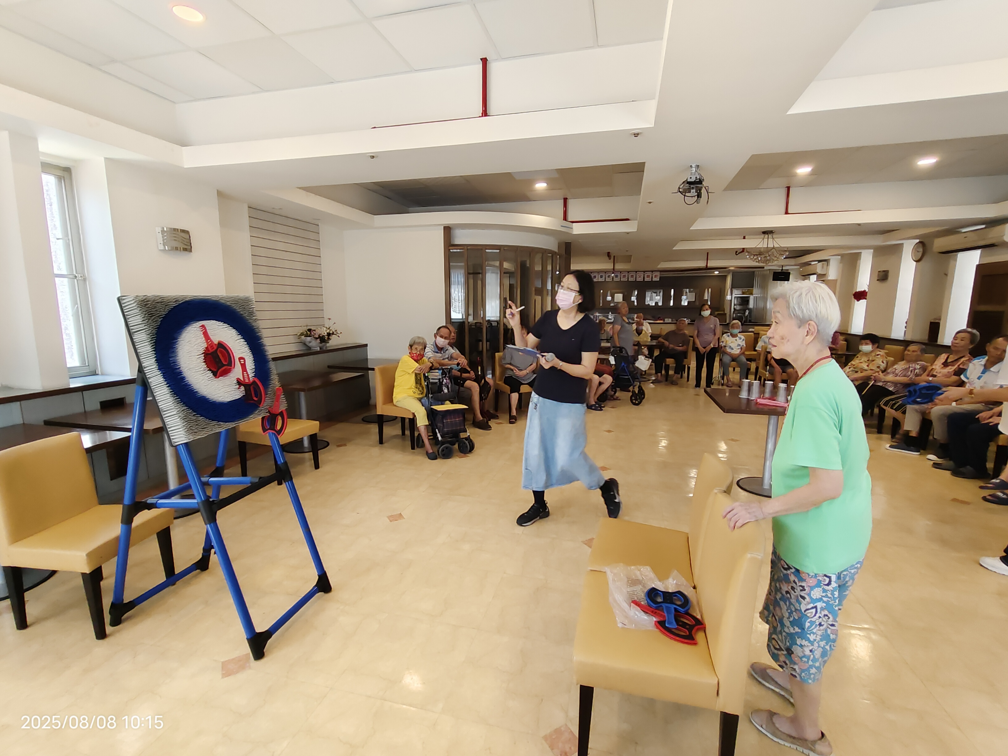 早晨的陽光灑進敬老所餐廳活動會場,第一個登場的是別具趣味的「同心協力」遊戲。長輩們四人一組,手上各拉住橡皮筋的一角,齊心協力地將紙杯堆疊起來。過程中需要默契且高度專注與穩定的手眼協調,一旁的加油聲與歡笑聲此起彼落,讓原本看似安靜的遊戲充滿了活力。接下來的「斧頭射靶」更是熱鬧,長輩們認真瞄準,雖然不一定命中,但每一次嘗試都贏得滿場鼓勵。這些互動,不只是遊戲,更像是心與心的交流,讓每位參與者都笑得像孩子般燦爛。