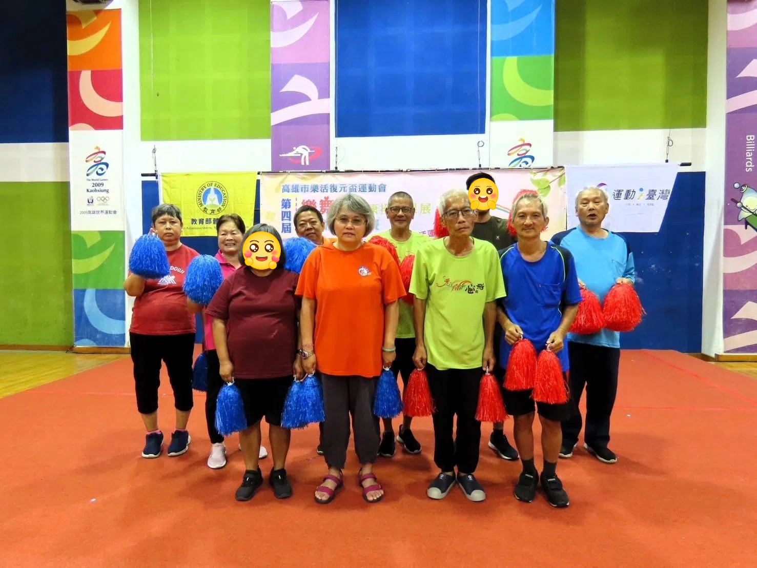 就這樣,我們以「活力四色」的隊名報名了此次的活動,當天來到了活動現場,現場沸沸揚揚,好不熱鬧,而住民們也抱著期待的心情等待著活動的開幕。活動開始前,由麥克斯律動舞蹈老師帶領大家一起先做個熱身操,暖暖身子,之後比賽即將開始,等待上場的過程中,有些住民來跟我分享,「某某團隊的服裝打扮得好漂亮哦」、「某某團隊的人好多、好熱鬧」,雖然住民是抱著分享的心情來跟我說,但我知道他們可能是感受到自己與他人的差別,所以產生了擔心,而我也回應了他們,「其實我們的服裝也很漂亮,色彩繽紛的,大家也不要緊張,今天就當作是一日遊,來交朋友的」聽完後,住民看起來也比較放鬆,臉上開始出現笑容,甚至有些住民開始賣力地跟著跳舞了。