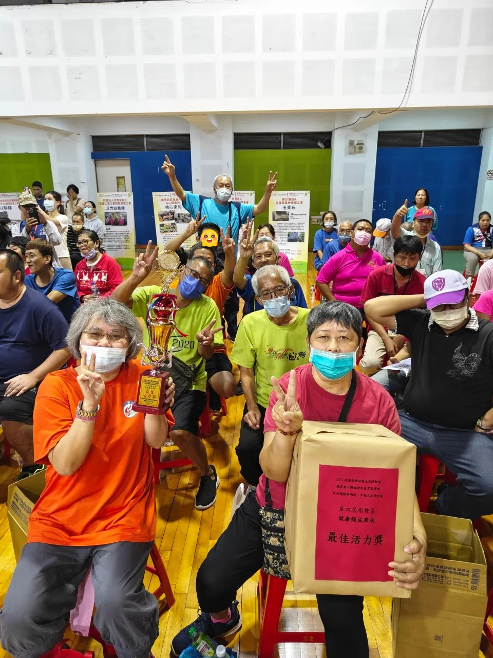 終於輪到我們準備上場了,表演開始前,我也紛紛給他們加油打氣,讓他們感受這是一場演出,而不是一場比賽,沒有評審老師、沒有分數、更沒有名次,就像是每天在機構裡跳的健康操一樣,只是底下多了很多觀眾為我們喝采,果不其然,上場後,住民們的表現比起平日所練習的狀況還要好太多了,雖然過程中一定會有小小的出錯,但他們也都不怯場,努力地完成了整段演出,要知道光是敢站在台上就要很大的勇氣了,更何況底下還有好多人都正在看著他們,連我在台下都不禁為他們鼓掌,我頓時理解了這場活動辦理的目的,不需在意旁人的眼光,不用擔心會跳錯,每位精神康復者都在這場活動中散發屬於自己的光芒及魅力,展現復元的成效,而最終我們隊榮獲了「最佳活力獎」,住民各個非常興奮地上台領獎,這個獎可說是住民們為自己獲得的其中一個獎,未來將持續在人生的舞台上散發著活力。
