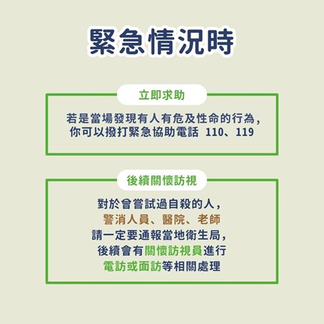 關於自殺風險的評估,大眾可透過手機(蘋果或android系統)下載APP『心情溫度計』,隨時自我檢測,簡易的五個問題,幫助自己找出下一步,也分享給身邊親愛的家人、朋友,養成習慣週週檢測;若有心理需求想找人傾訴,可撥打『安心專線』1925(諧音:依舊愛我)、『張老師專線』1980(諧音:依舊幫您)或『生命線』1995(尹救救我),上述電話為24小時服務,使用室內電話及公共電話皆免費,提供給需要的民眾運用。最後我要強調的是,自殺意念並非突發,約有6成想自殺的人在行為前曾發出警訊,當身邊有心情低落的人,我們可以成為一個伸手拉他一把的人,一句話、一個微笑,一聲問候,都可能讓他改變心情,解開心結。