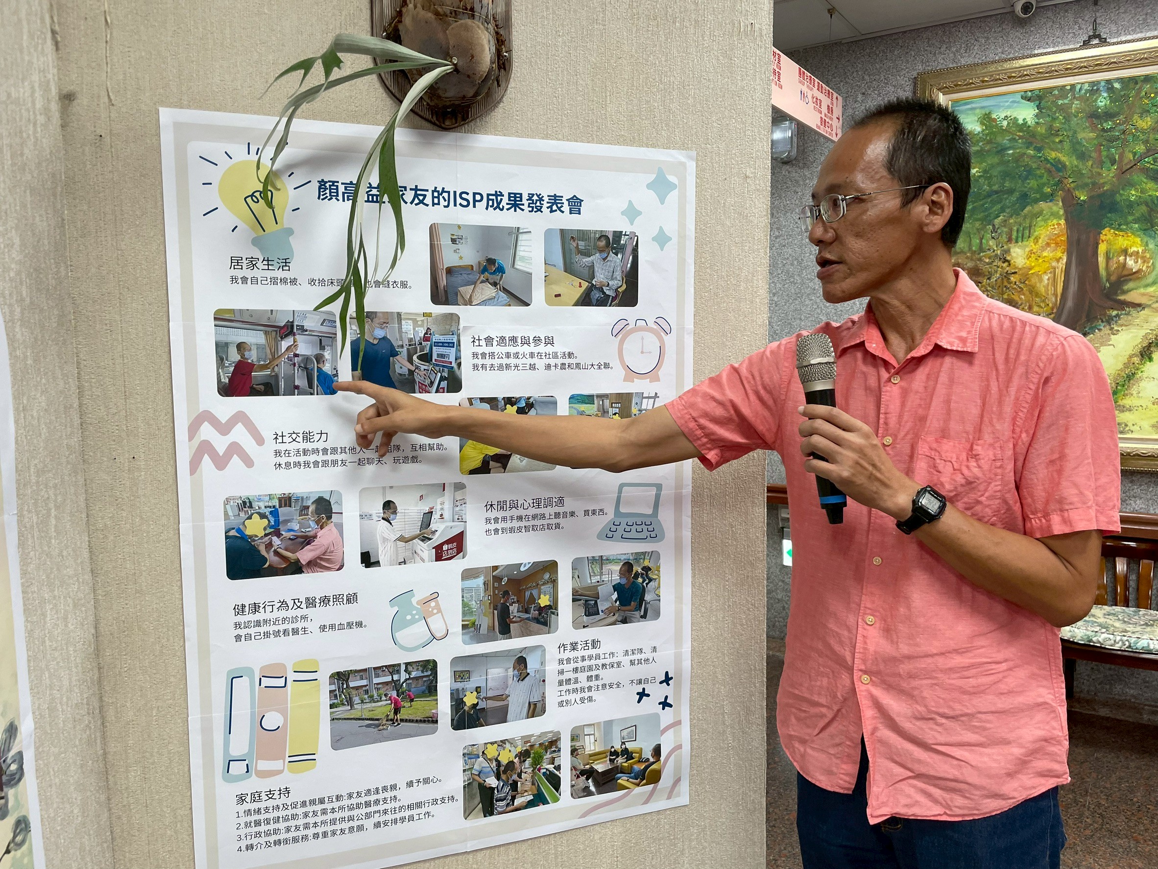 家友自信地站在海報前,手指著自己的ISP成果照片, 分享這一年在生活自理、社交能力與健康行為上的進步。 他以穩定的語調、清楚的表達,說出每一項努力背後的故事, 展現出從「被支持」到「能表達」的成長歷程。 這一刻,不僅是成果展示,更象徵著自我肯定與自我實現的開始。
