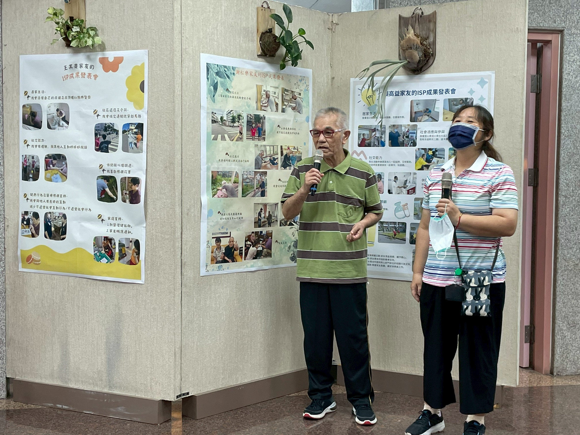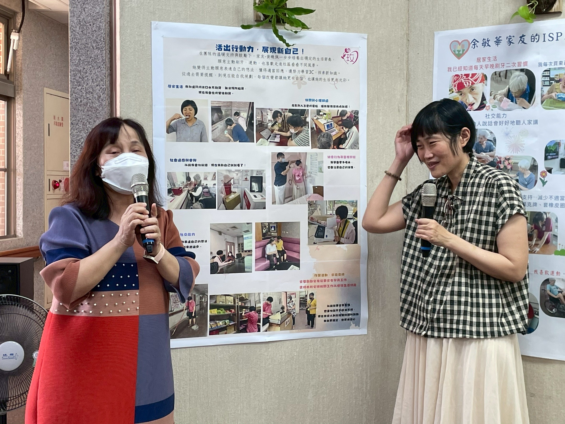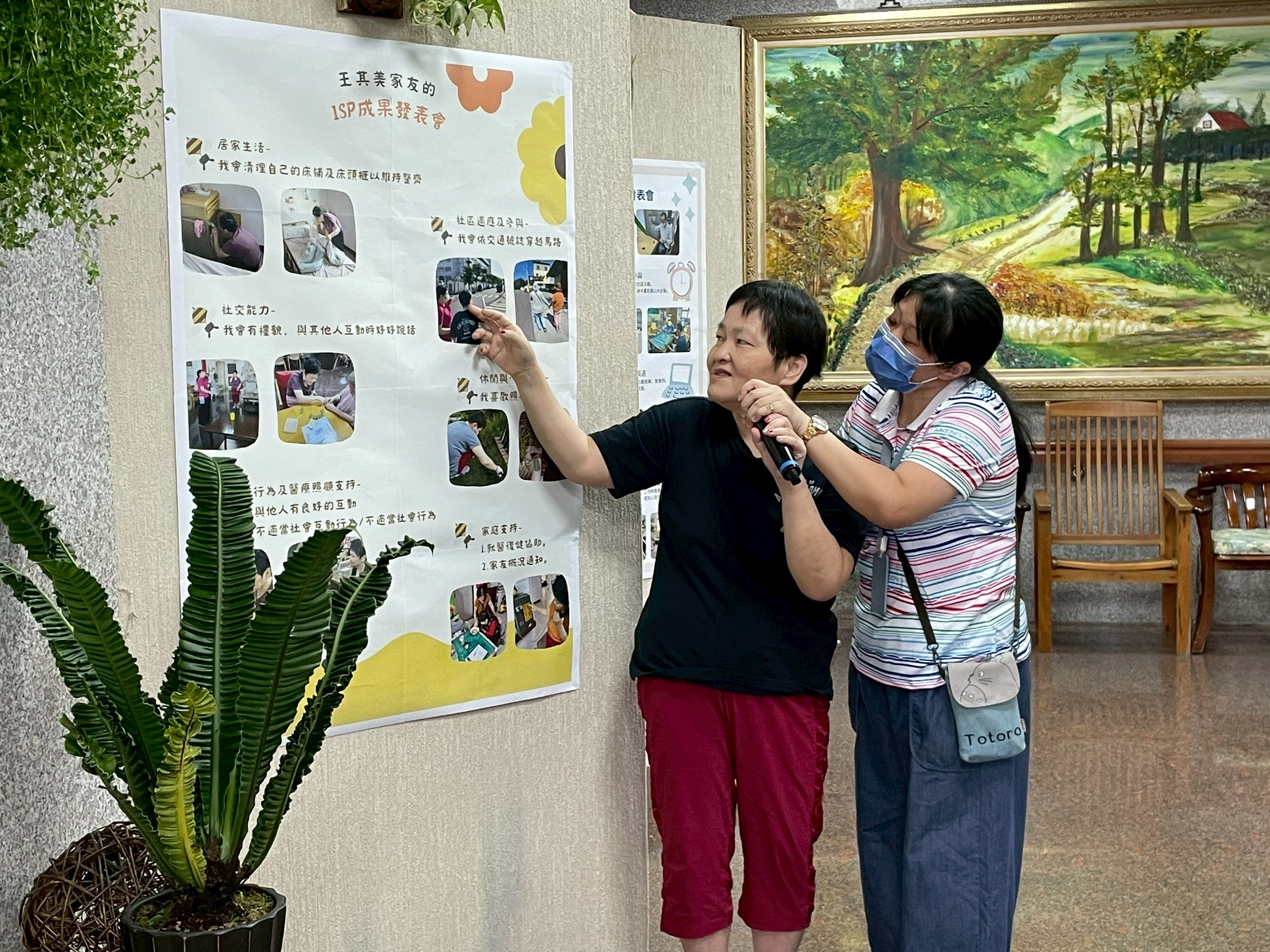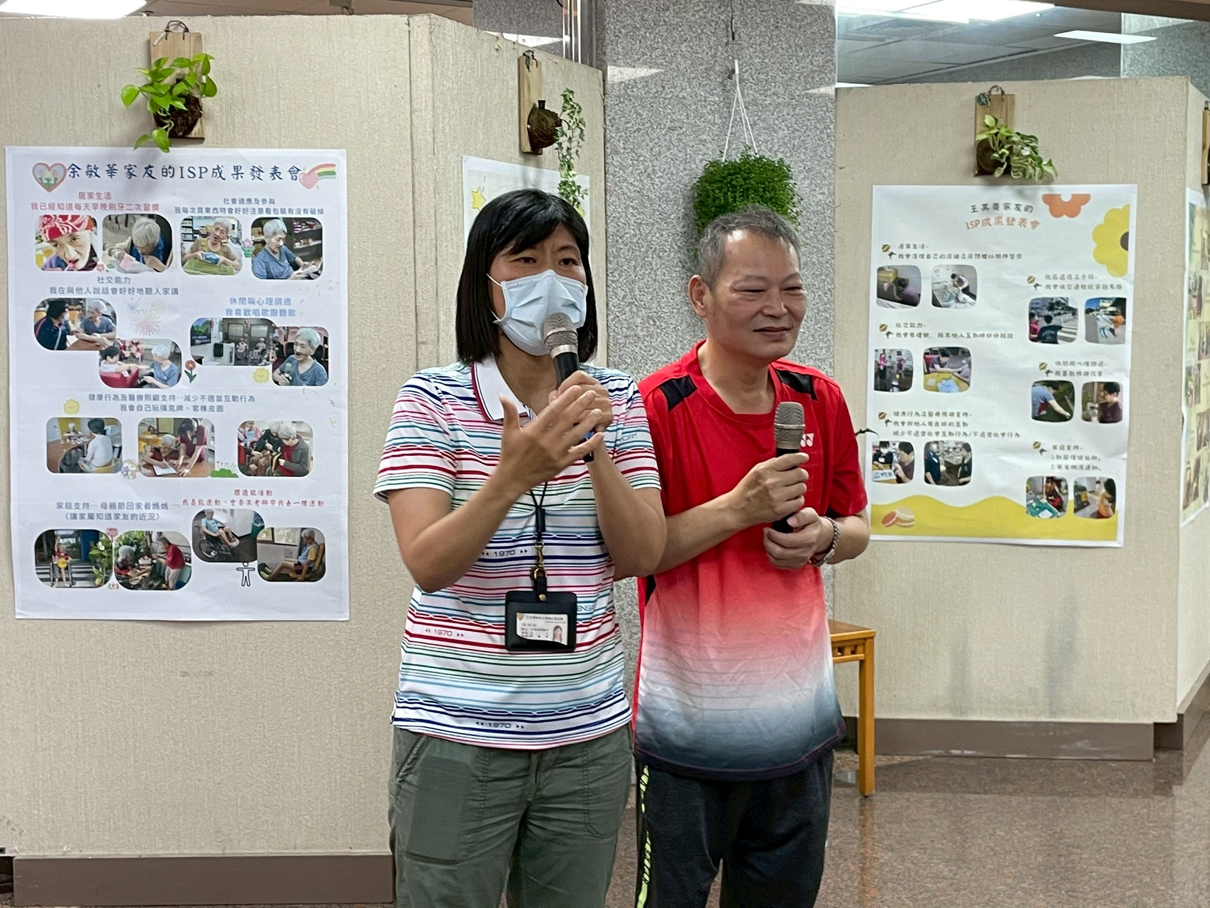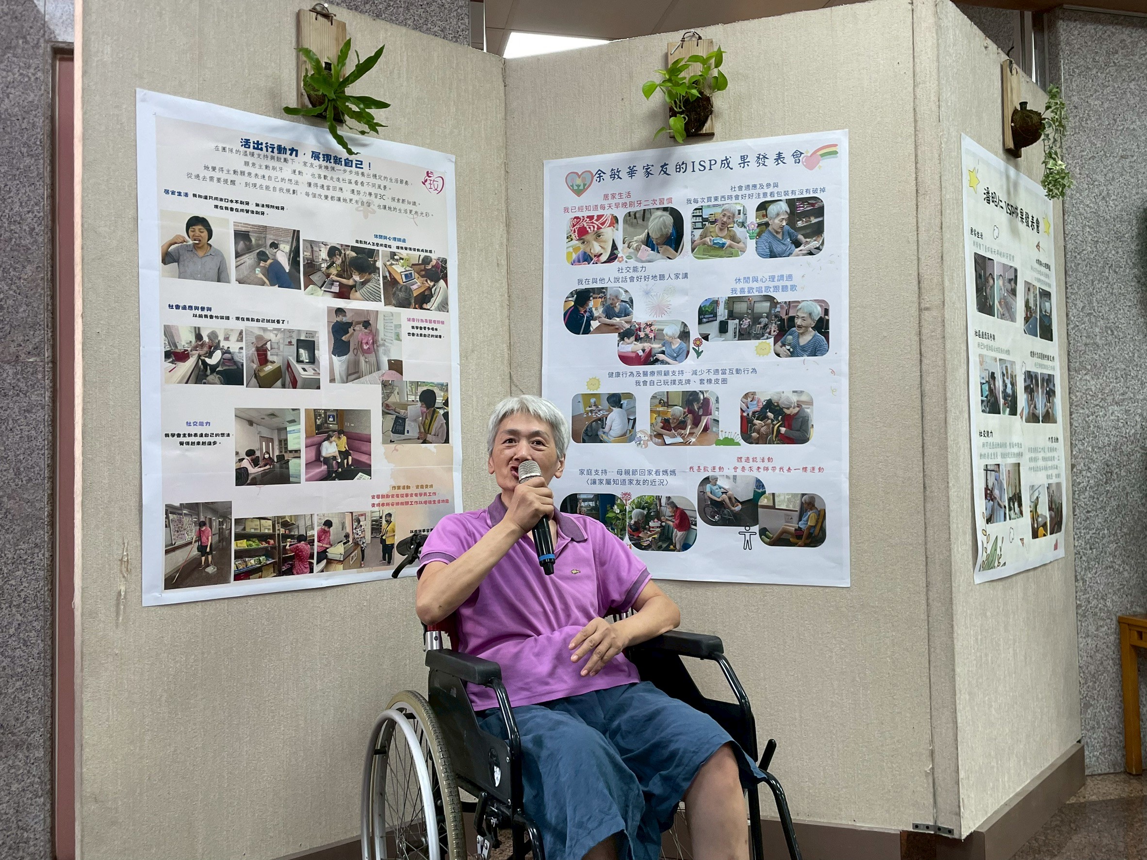 家友在樓層老師的陪伴下,自信地上台介紹自己的ISP成果。 她一邊拿著麥克風,一邊指著海報上的照片與文字, 分享自己在生活自理、社交互動與行為調整上的進步。 老師在旁輕聲引導與鼓勵,讓家友能安心表達、展現成就感。 這一刻,不只是發表成果,更是家友學習自我表達與被傾聽的重要時刻。