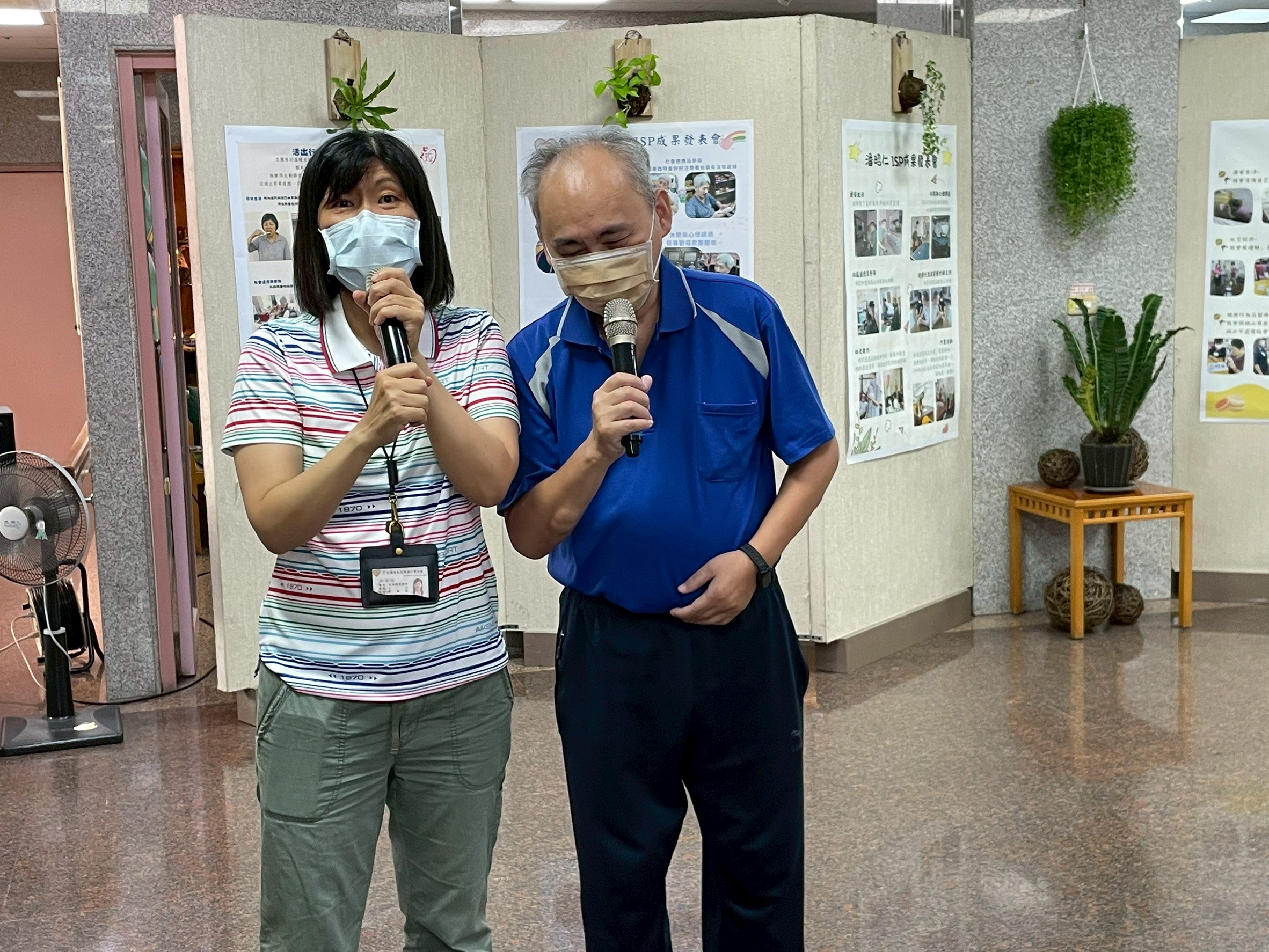 主任在家友分享結束後上前致詞, 肯定家友在這一年中於ISP目標上的努力與改變。 家友靦腆地微笑,手中仍握著麥克風, 臉上流露出完成發表後的喜悅與自豪。 這一刻,是被看見與被肯定的時刻, 象徵著努力被聽見、成長被珍惜的美好成果。